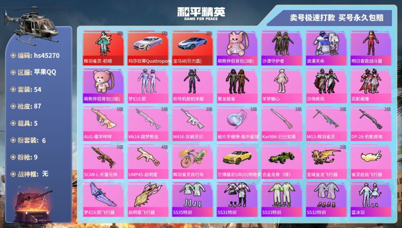 hs45270 苹果手Q-4王牌印记-6粉装-9特效枪-5载具-39917热力值-54套装-87枪皮