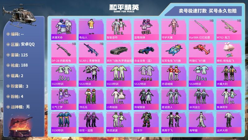 hs45274 安卓手Q-9王牌印记-3粉装-4特效枪-2载具-58553热力值-125套装-188