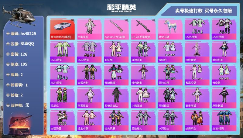 hs45229 安卓手Q-10王牌印记-1粉装-2特效枪-2载具-38620热力值-126套装-10