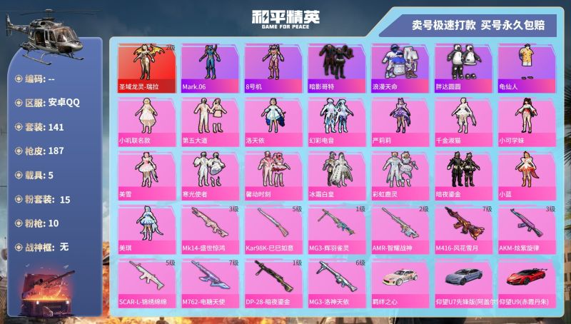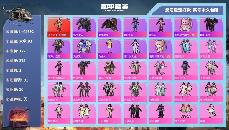 hs45795 安卓v-1王牌印记-1粉装-1特效枪-1载具-11277热力值-28套装-45枪皮