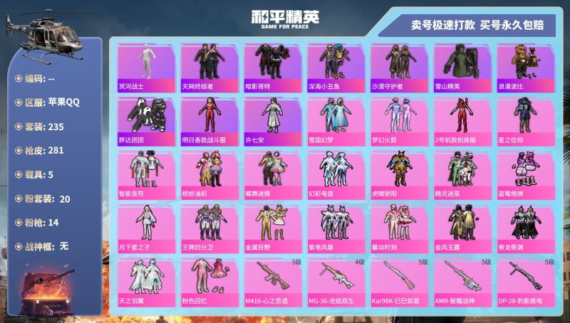 hs45434 苹果手Q-3王牌印记-9粉装-2特效枪-1载具-33508热力值-70套装-81枪皮