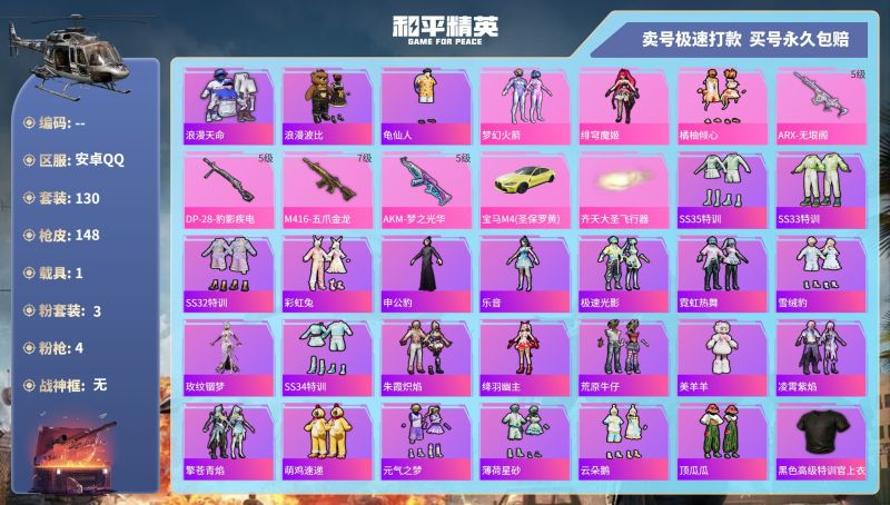 hs45343 安卓手Q-8王牌印记-3粉装-4特效枪-1载具-50226热力值-130套装-148