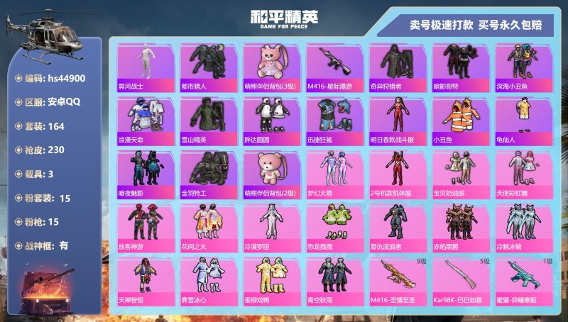 hs44900 安卓手Q-15王牌印记-有战神框-15粉装-15特效枪-3载具-82230热力值-1