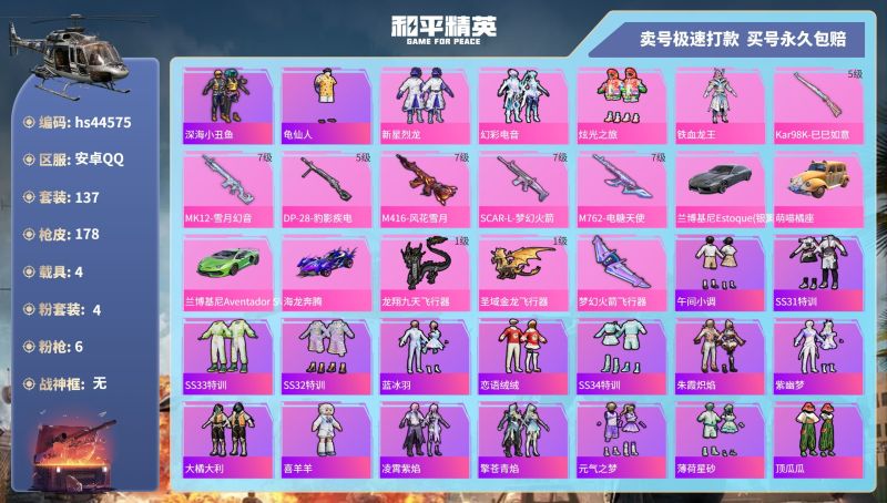 hs44575 安卓手Q-15王牌印记-4粉装-6特效枪-4载具-60521热力值-137套装-17
