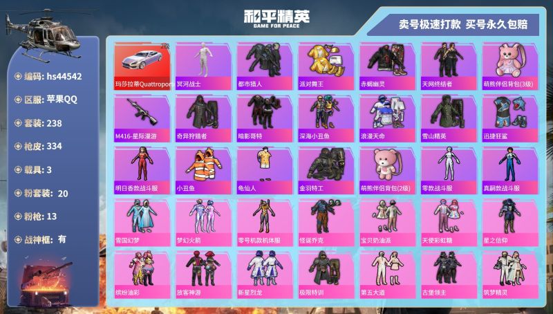 hs44536 苹果手Q-17王牌印记-11粉装-11特效枪-3载具-98968热力值-224套装-
