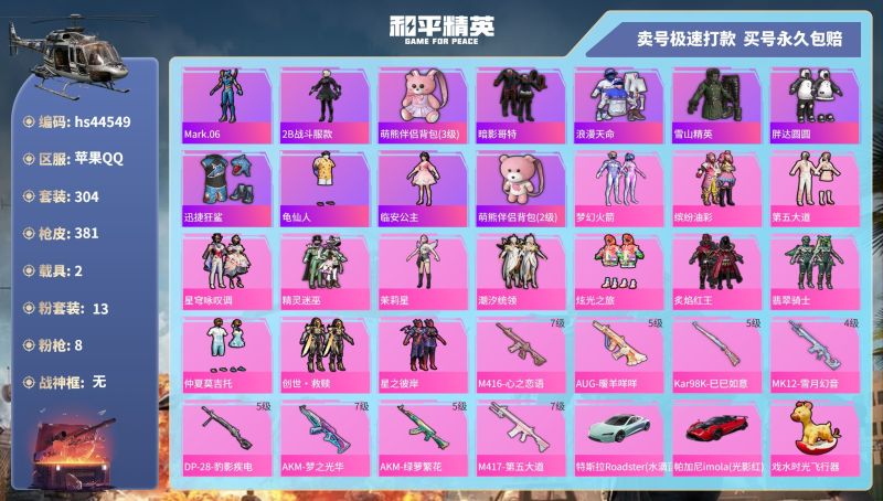 hs44549 苹果手Q-21王牌印记-13粉装-8特效枪-2载具-134385热力值-304套装-