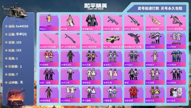 hs44550 安卓手Q-4王牌印记-2粉装-7特效枪-1载具-48060热力值-103套装-162