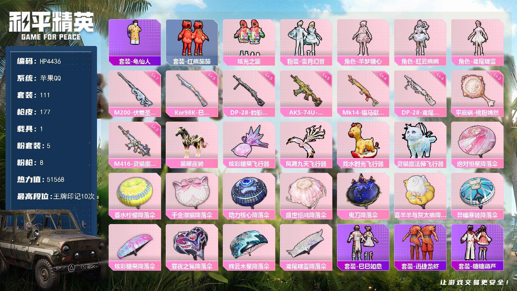 苹果 手Q-5粉装-8特效枪-1载具-4粉色飞行器-51568热力值-10王牌