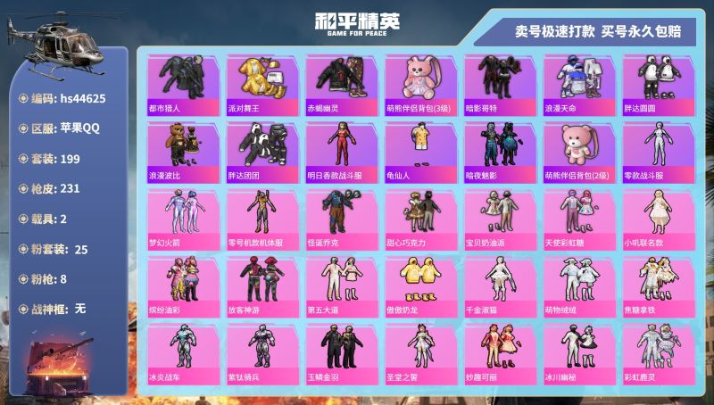 hs44625 苹果手Q-9王牌印记-25粉装-8特效枪-2载具-87676热力值-199套装-23