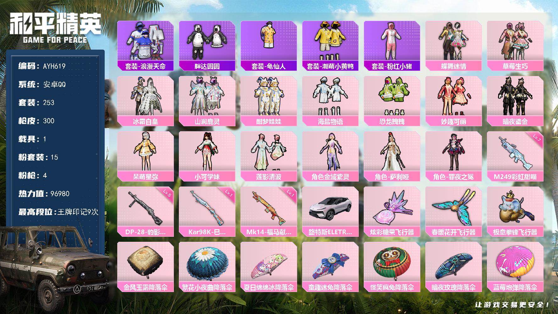 安卓 手Q-15粉装-4特效枪-1载具-3粉色飞行器-96980热力值-9王牌