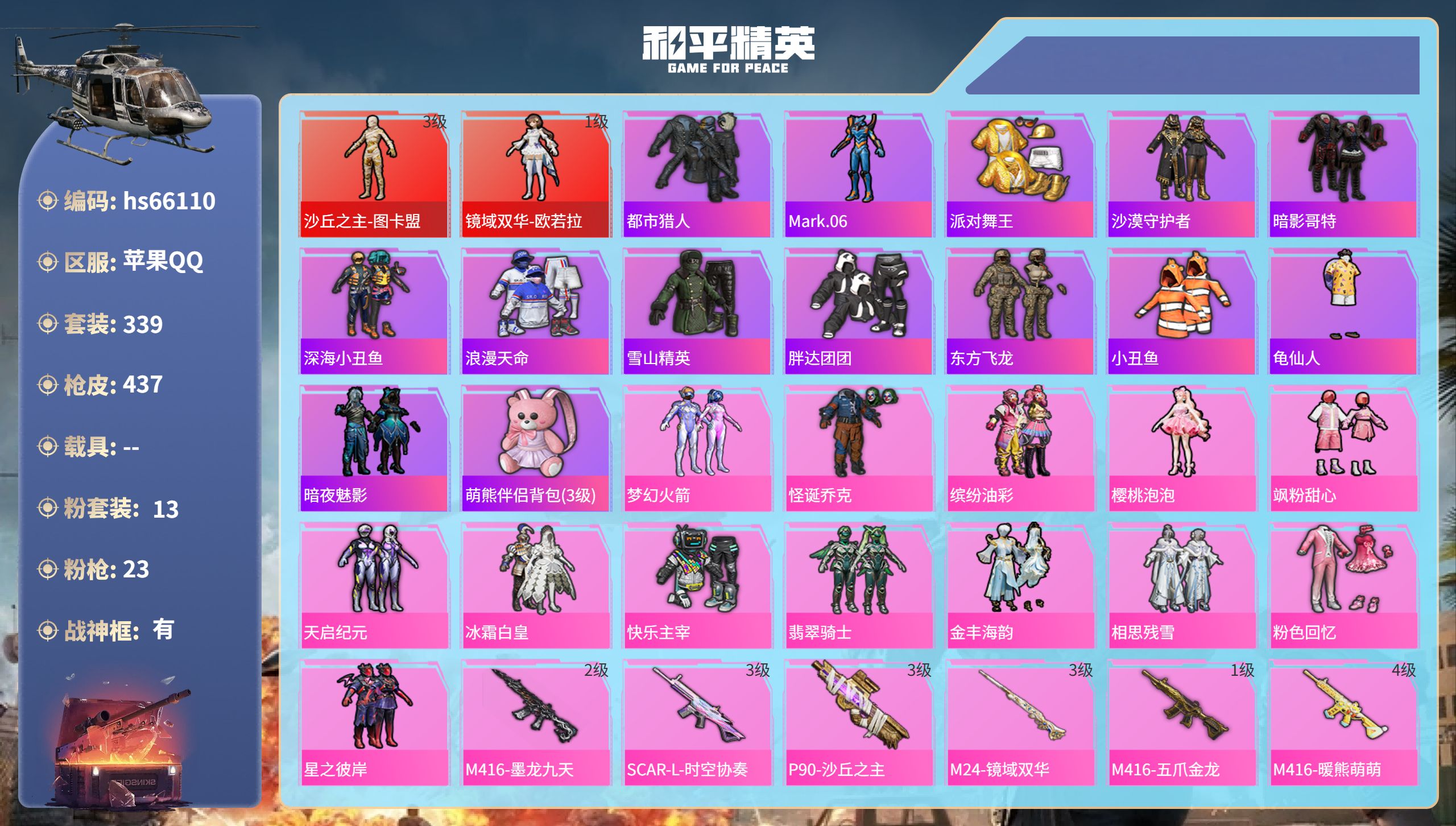 hs66098 苹果手Q-13王牌印记-有战神框-1红装-9粉装-12特效枪-2载具-80396热力