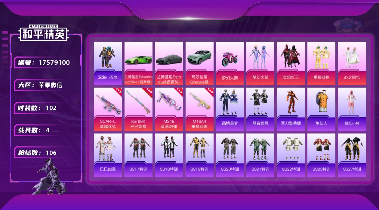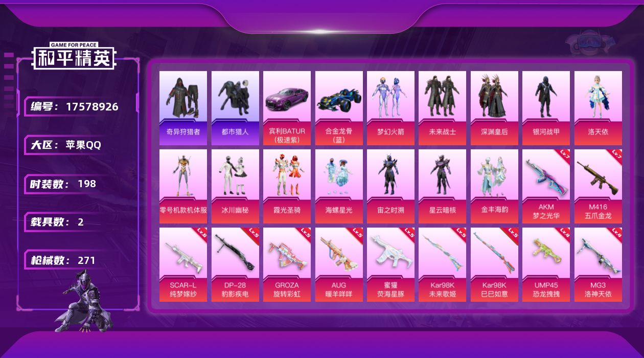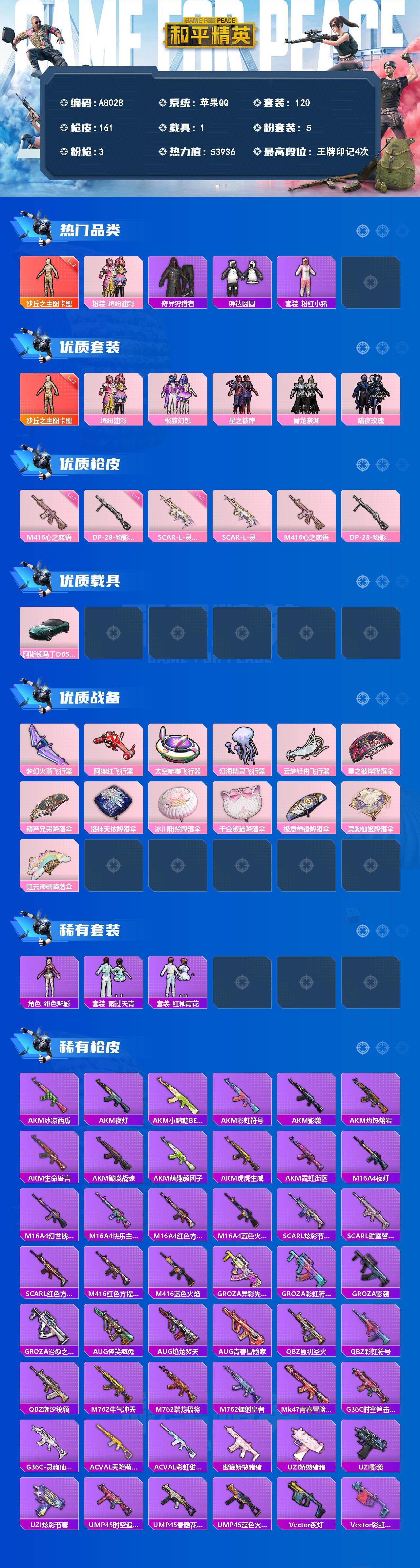 苹果手Q-2王牌印记-1粉装-3特效枪-1载具-9362热力值-
