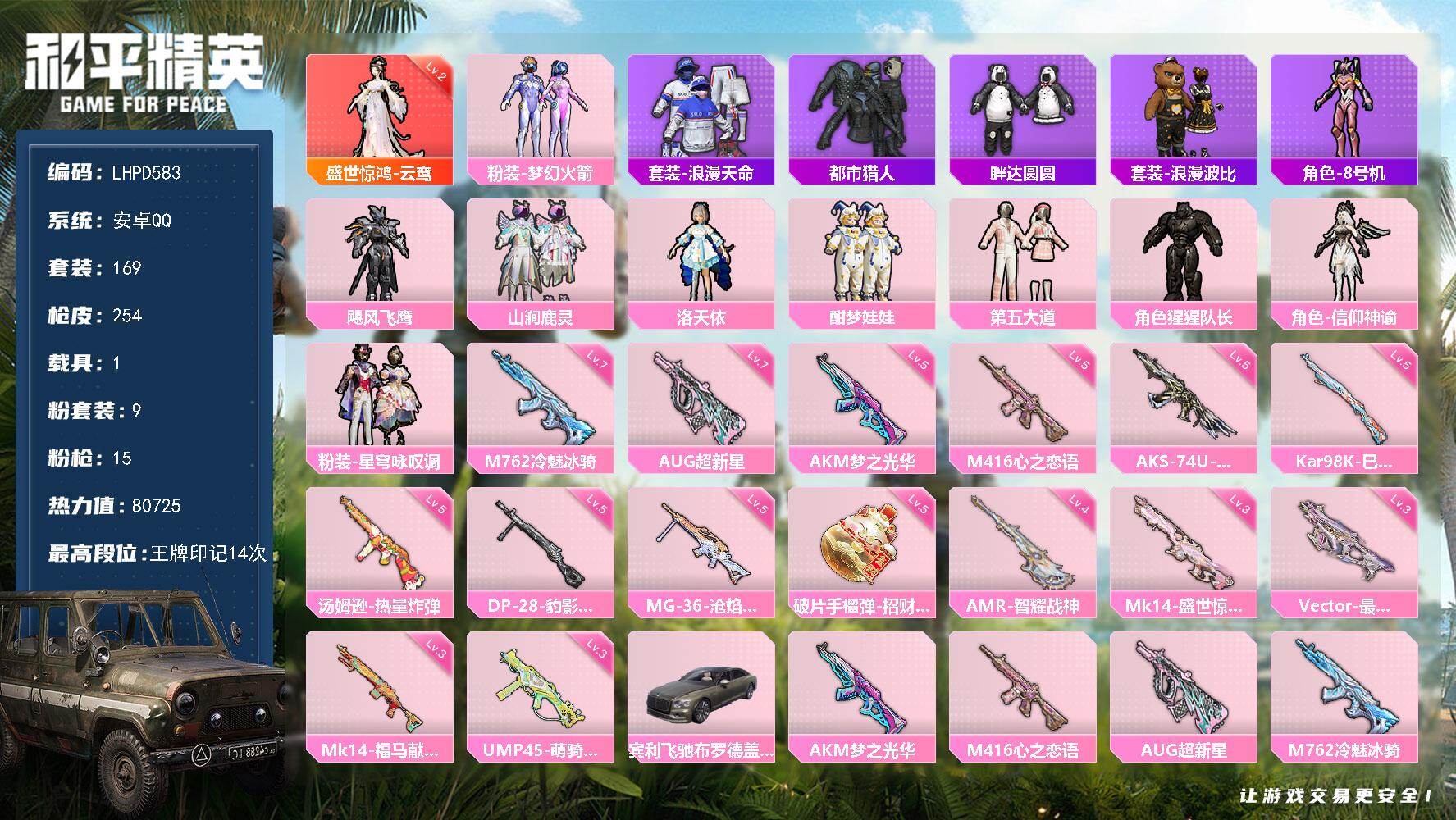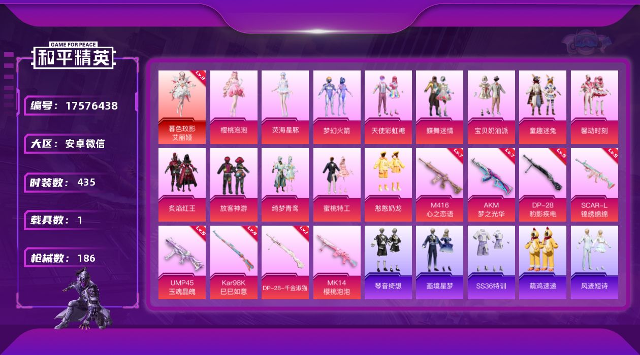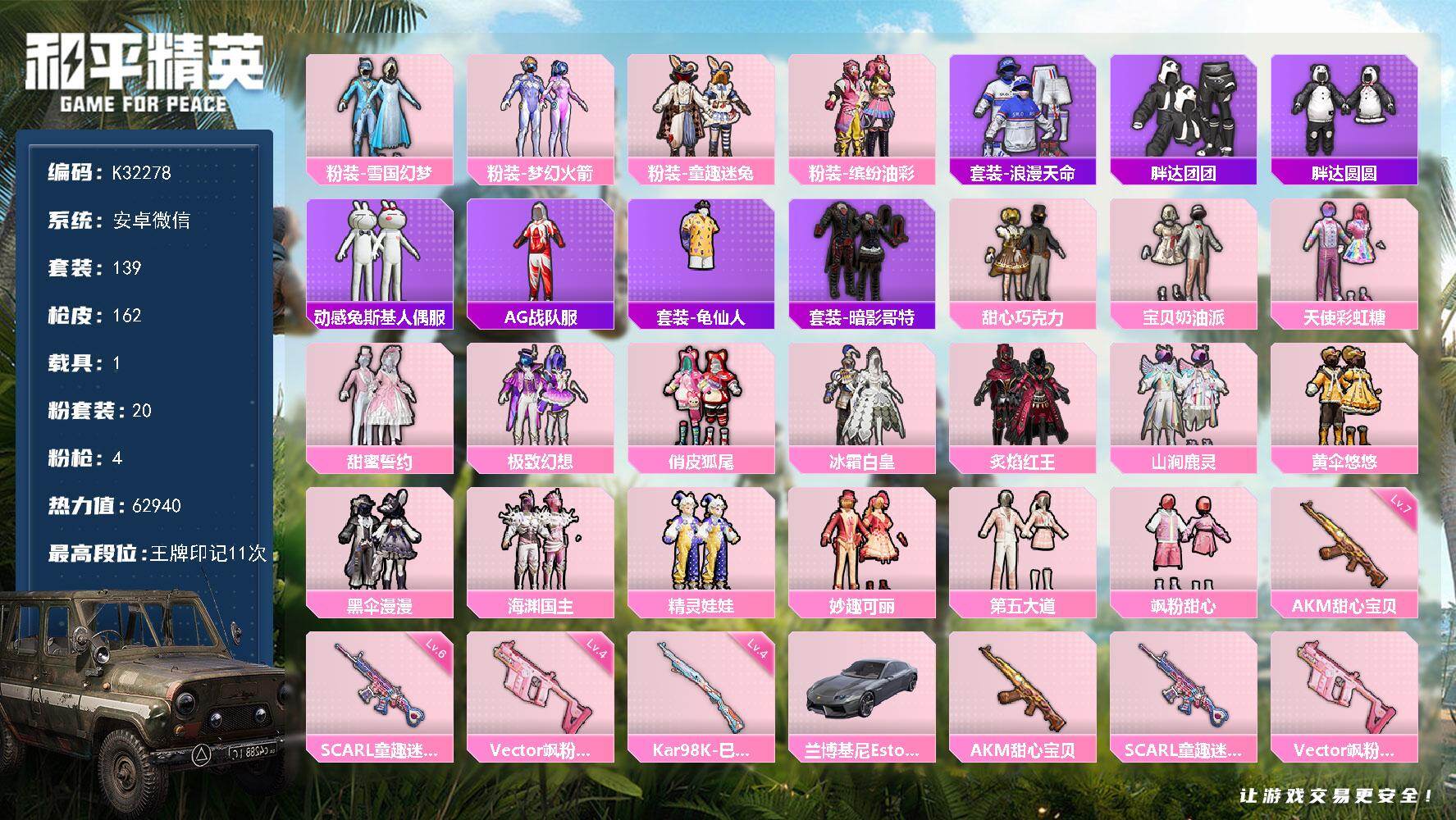 安卓 微信-20粉装-4特效枪-1载具-2粉色飞行器-62940热力值-11王牌