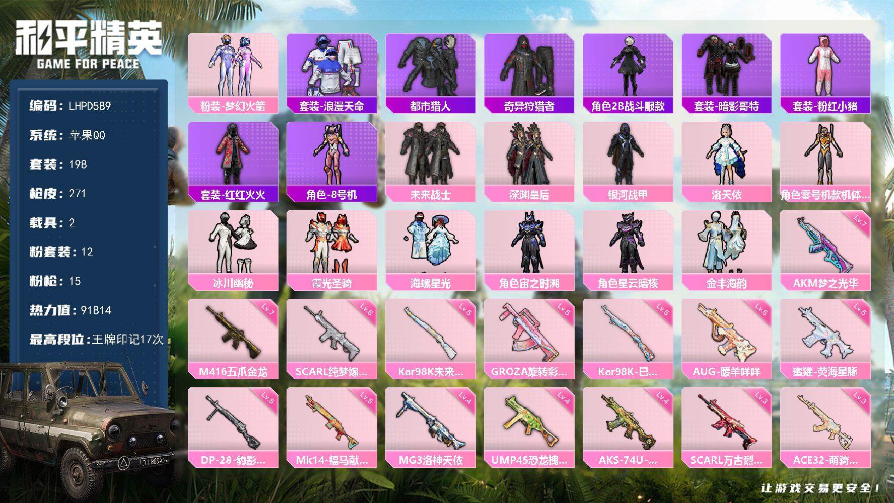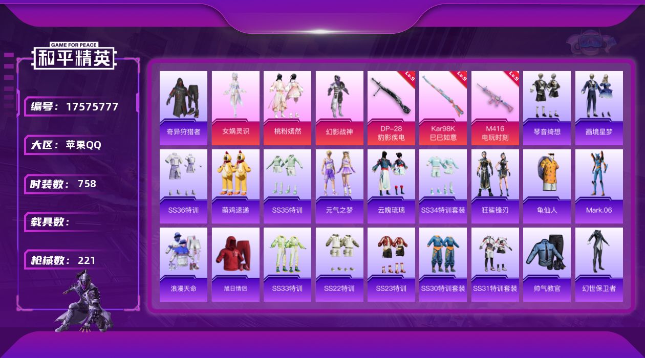苹果 手Q-3粉装-7特效枪-1载具-2粉色飞行器-34150热力值-6王牌印记