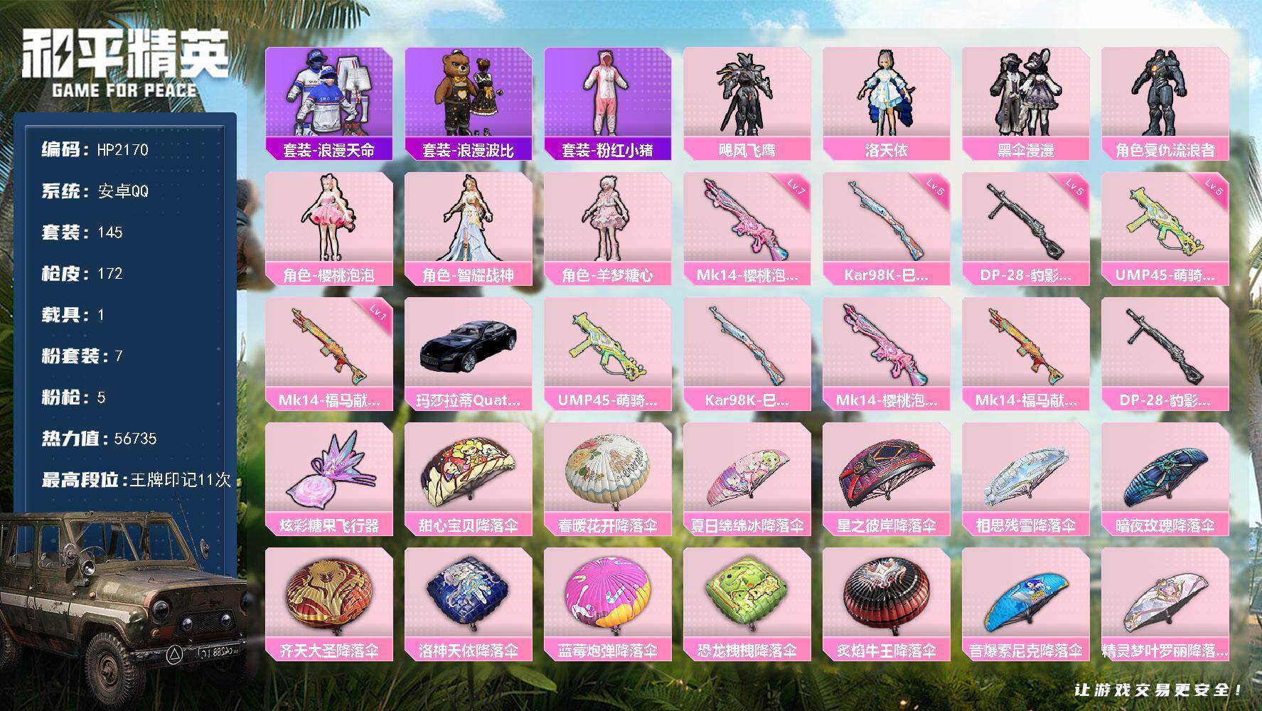 【店主推荐捡漏号!可直接换绑】安卓 手Q-21粉装-6特效枪-3载具-8粉色飞