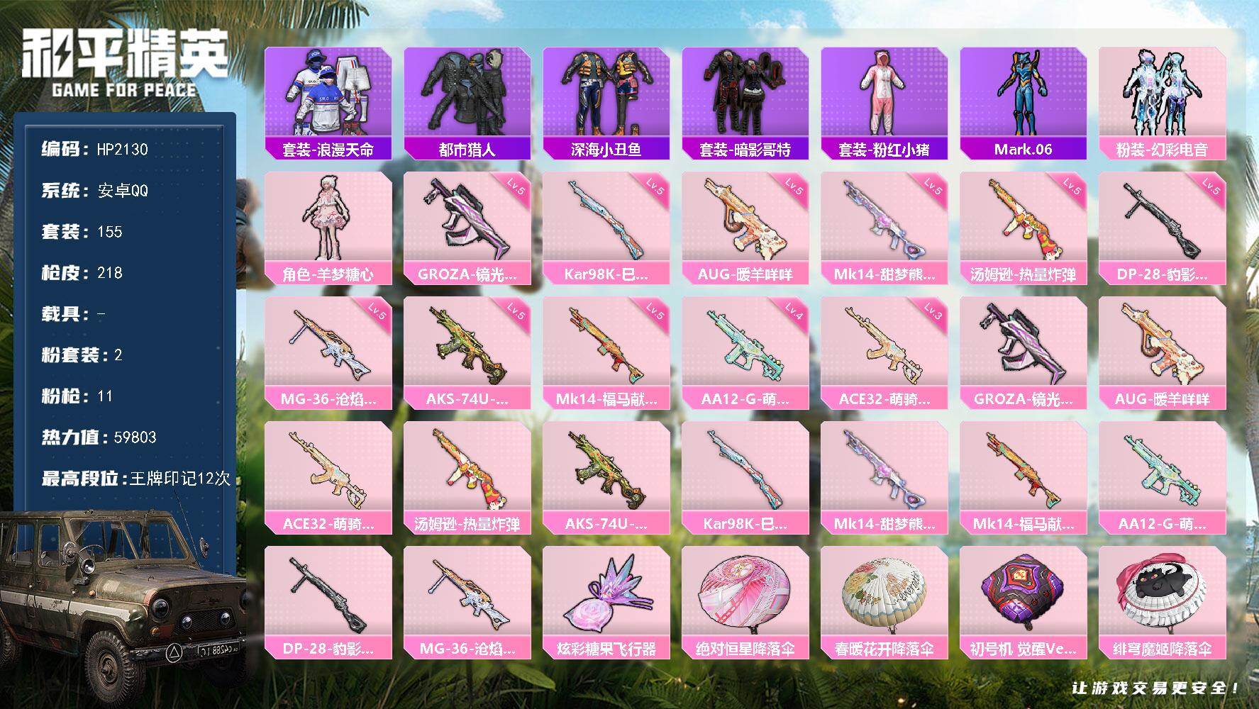 【12粉装13特效枪2载具】 安卓V区-80082热力值-14印记-191套装-