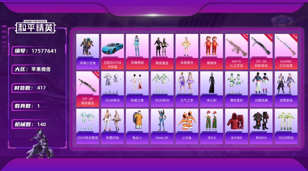 1载具-112套装-140枪皮-10王牌印记-4粉装-4特效枪-1载具
