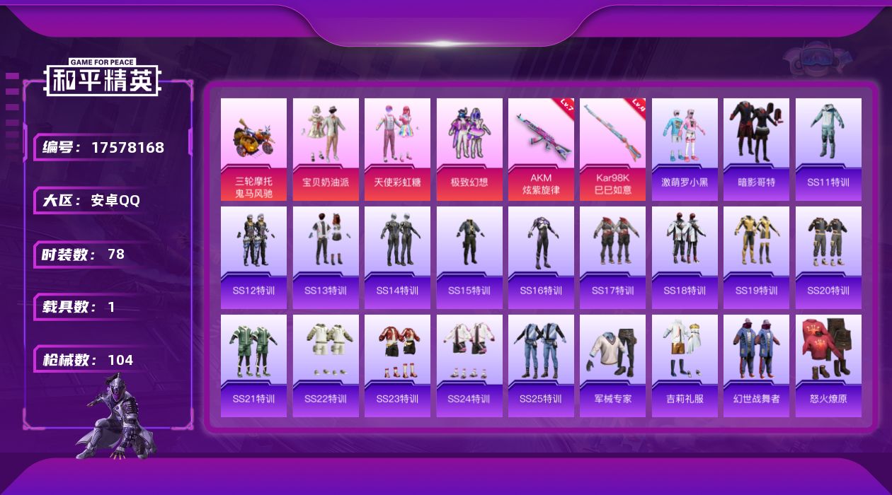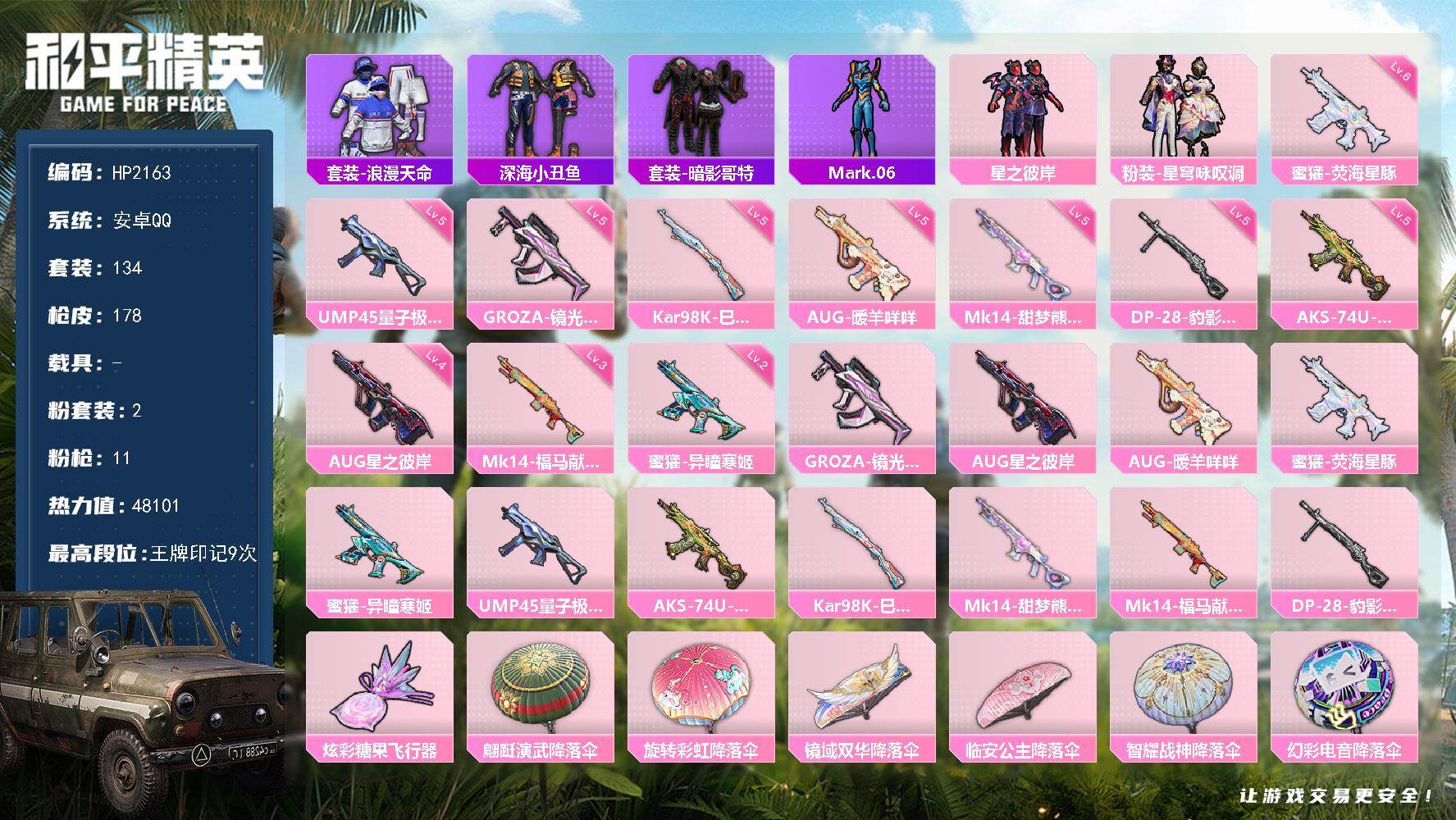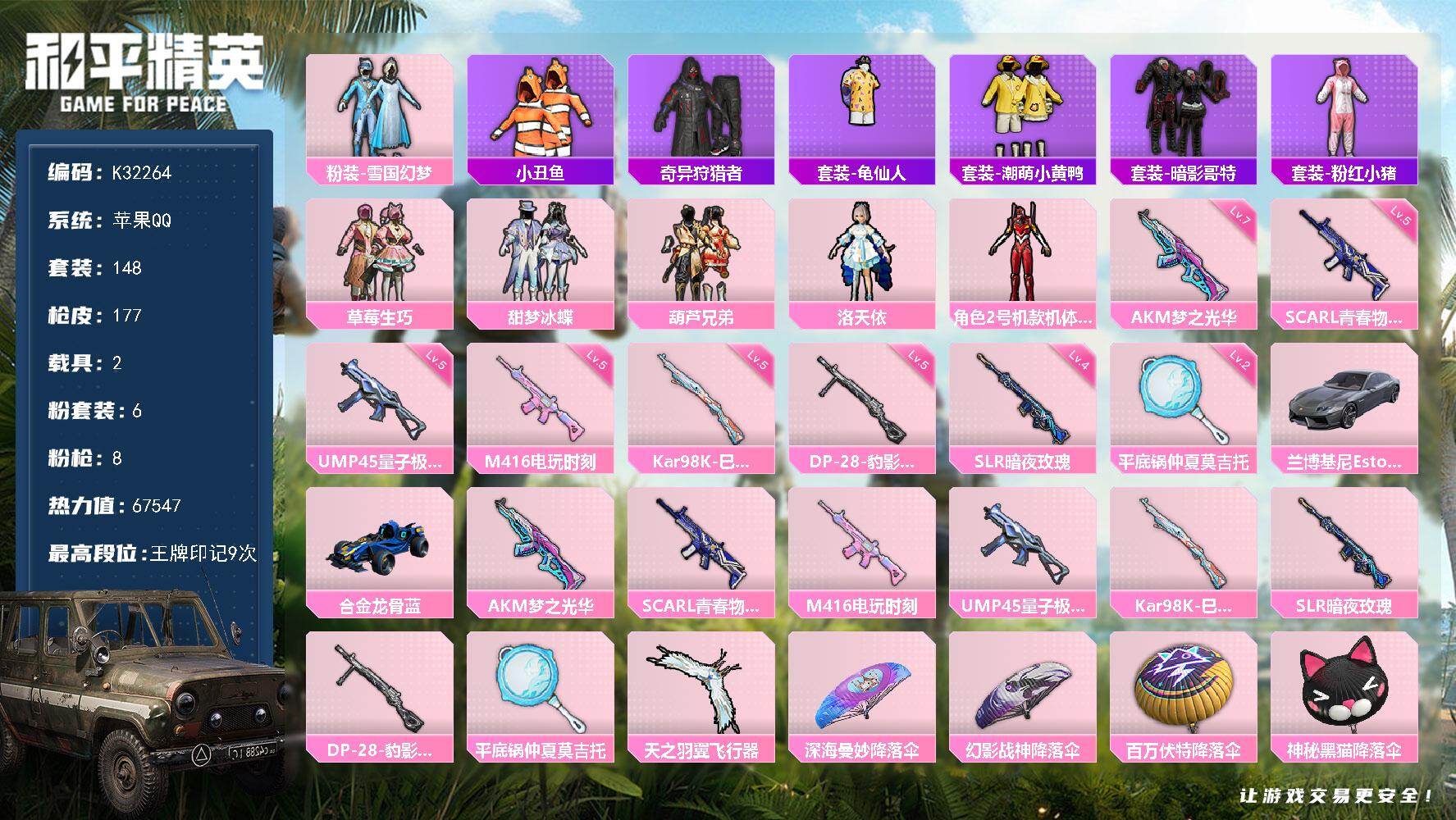 6粉装-8特效枪-2载具-1粉色飞行器-67547热力值-9王牌印记-148套装-177枪皮