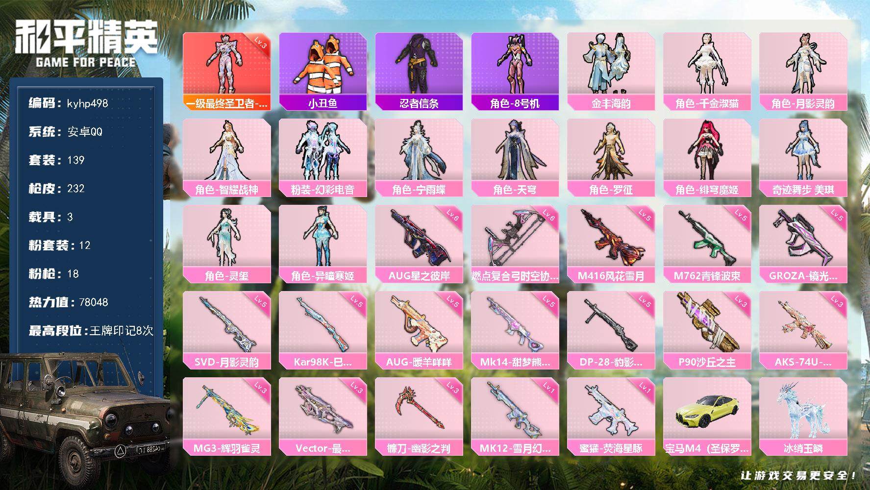安卓 手Q-1神装-12粉装-18特效枪-3载具-8粉色飞行器-78048热力值