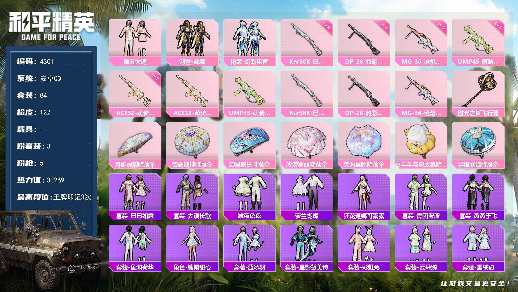 安卓 手Q-3粉装-5特效枪-0载具-1粉色飞行器-33269热力值-3王牌印记