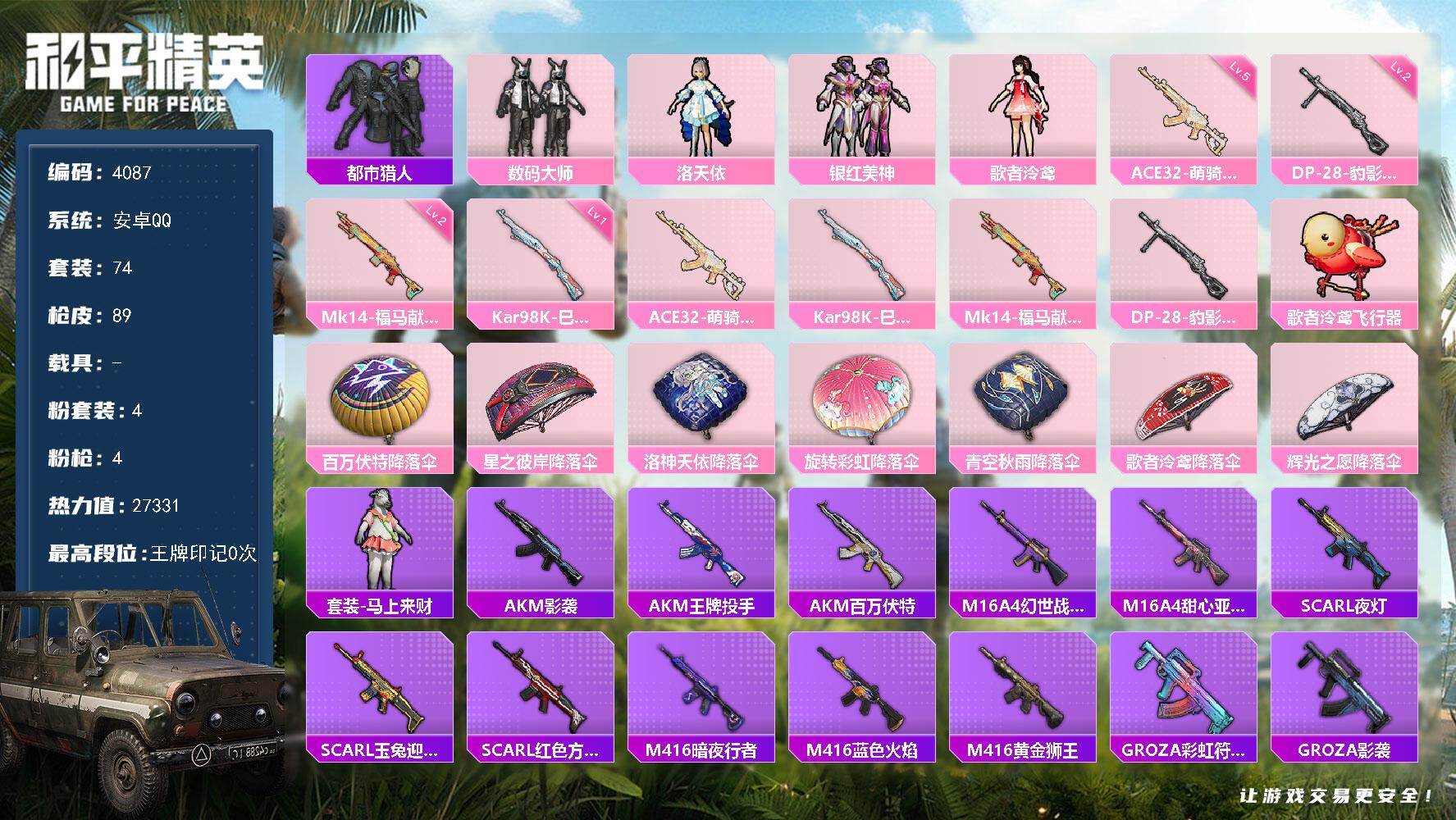 安卓 手Q-4粉装-4特效枪-0载具-1粉色飞行器-27331热力值-1王牌印记