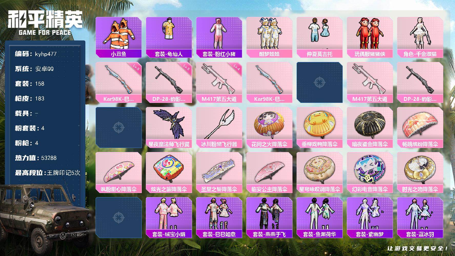 安卓 手Q-4粉装-4特效枪-0载具-3粉色飞行器-53288热力值-5王牌印