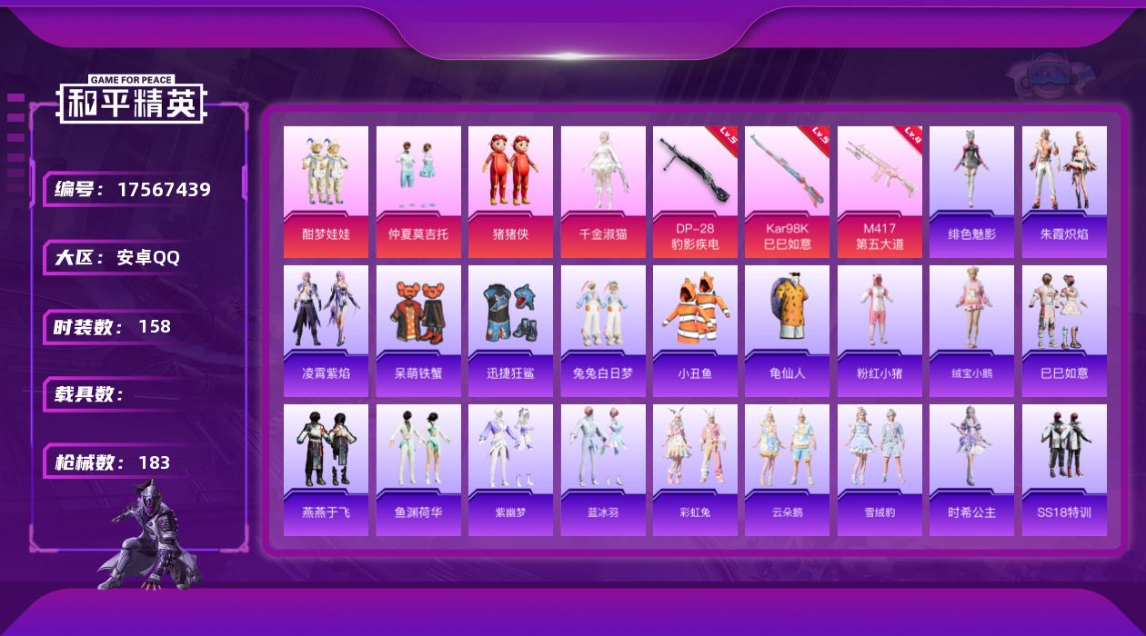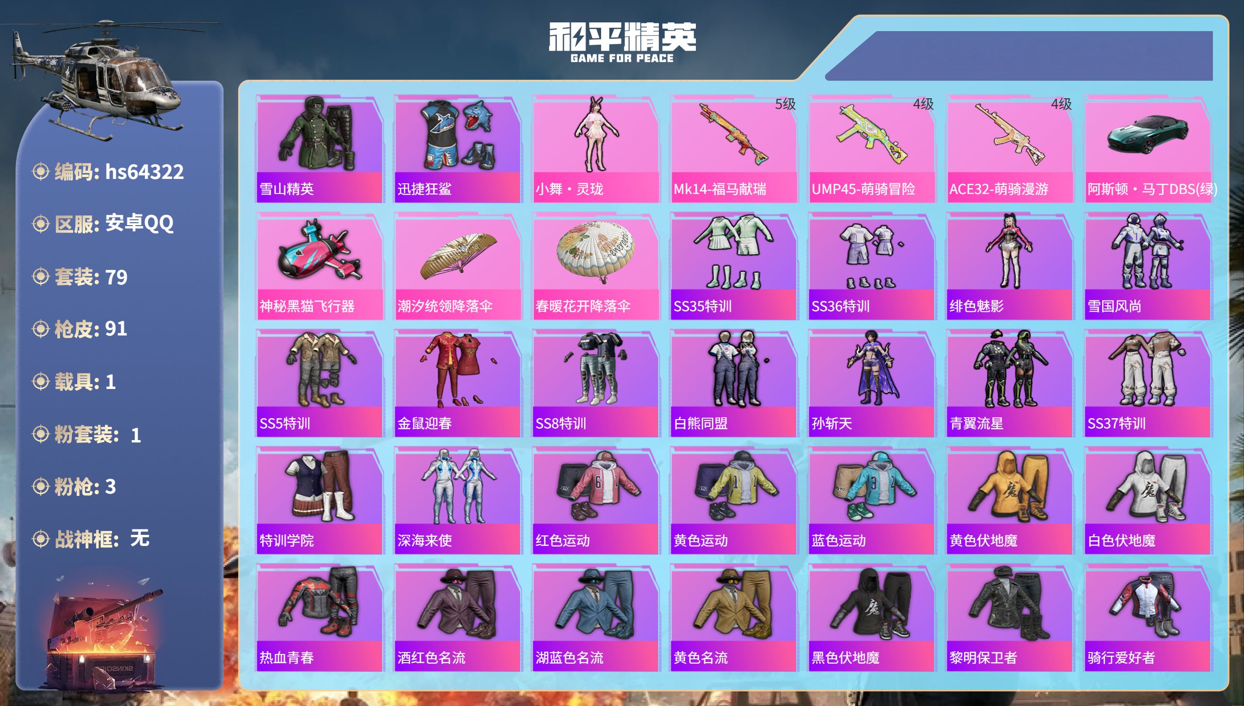 安卓 手Q-1神装-12粉装-18特效枪-3载具-8粉色飞行