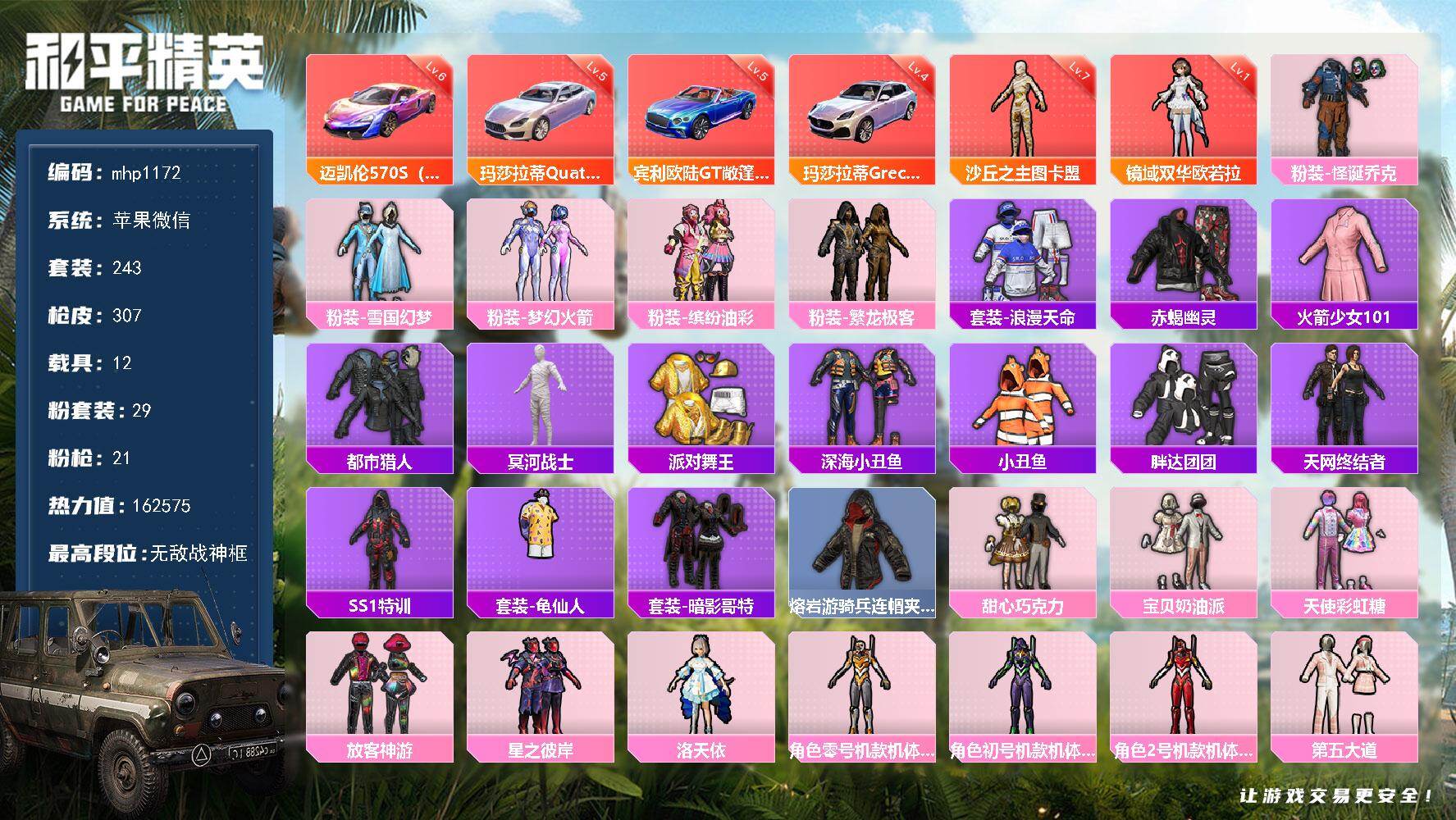 【mhp1172】苹果 微信-无敌战神框-2神装-29粉装-21特效枪-12载