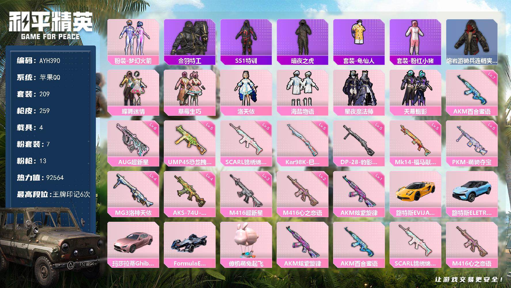 安卓 手Q-6粉装-7特效枪-0载具-3粉色飞行器-74655热力值-17王牌印