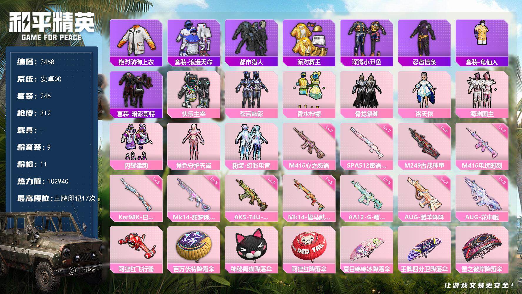 安卓 手Q-9粉装-11特效枪-0载具-2粉色飞行器-102940热力值-17