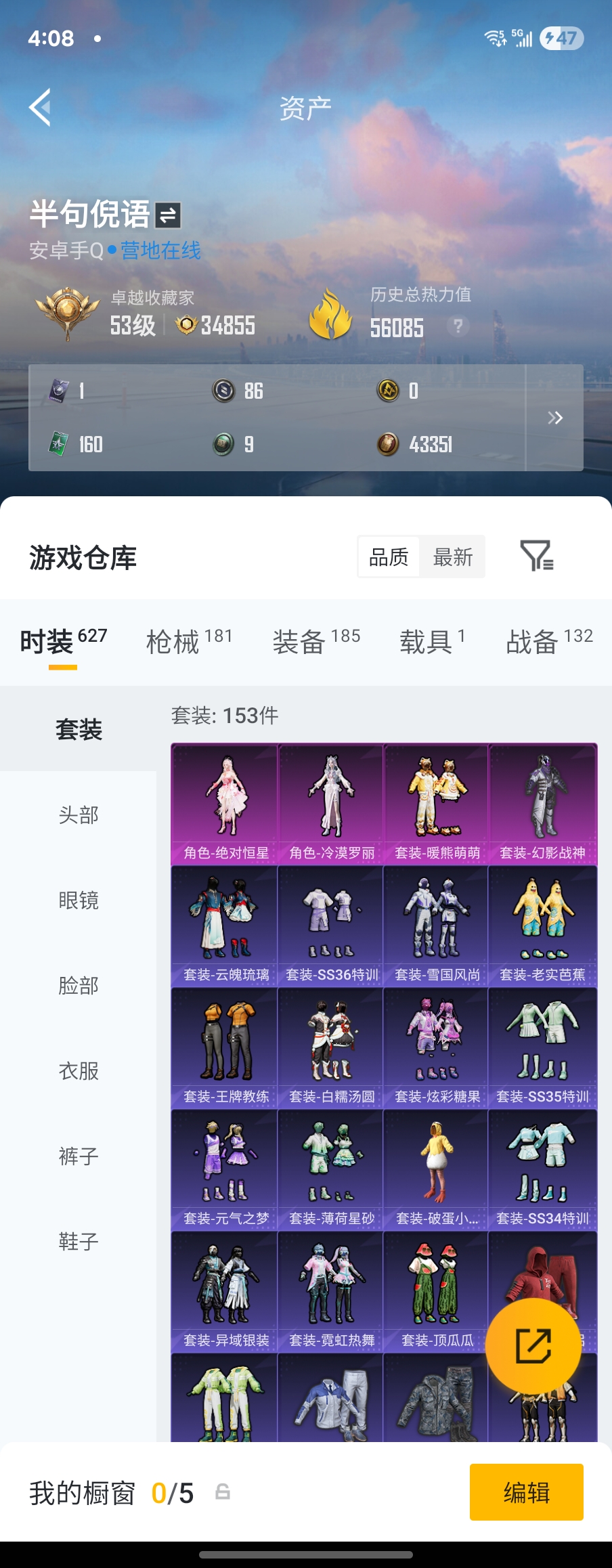 80套装/枪械6/装备152/载具2/战备72/王牌印记3/热力值39400/