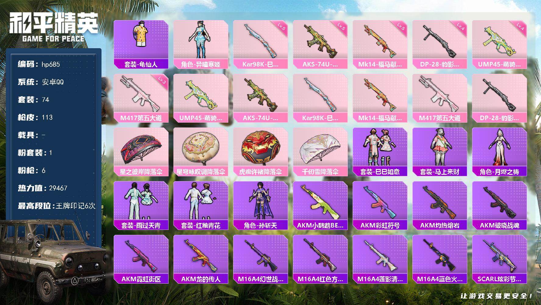 1粉装-6特效枪-0载具-0粉色飞行器-29467热力值-6王牌印记-74套装-113枪皮