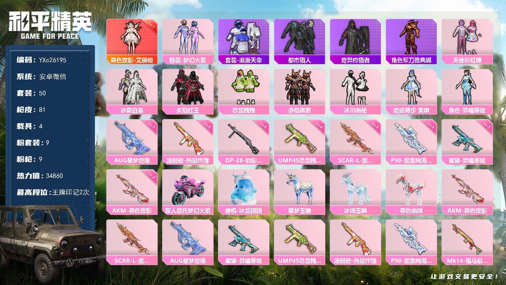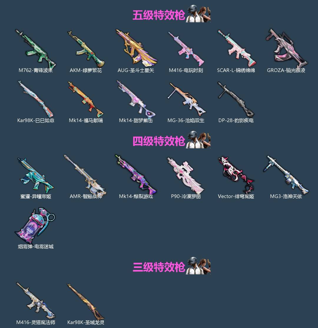 16粉装-12特效枪-1载具-3粉色飞行器-109034热力值-23王牌印记-237套装-293枪皮