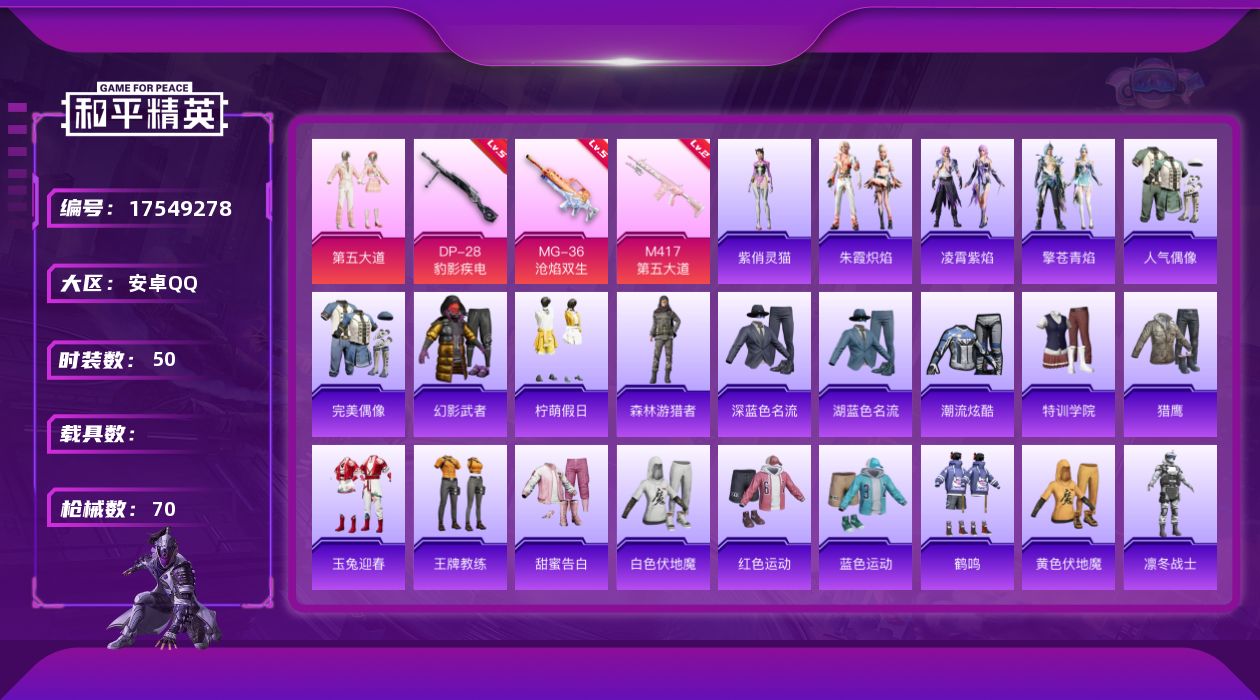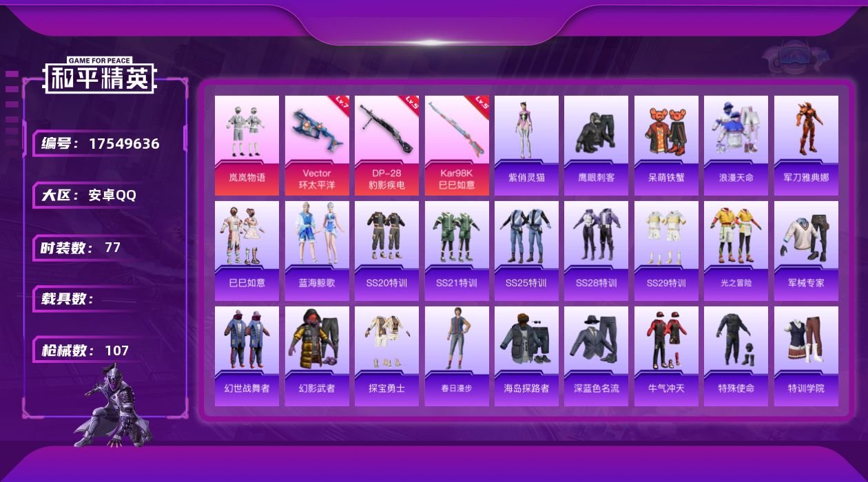 102套装/枪械9/装备232/战备118/王牌印记12/热力值52913/