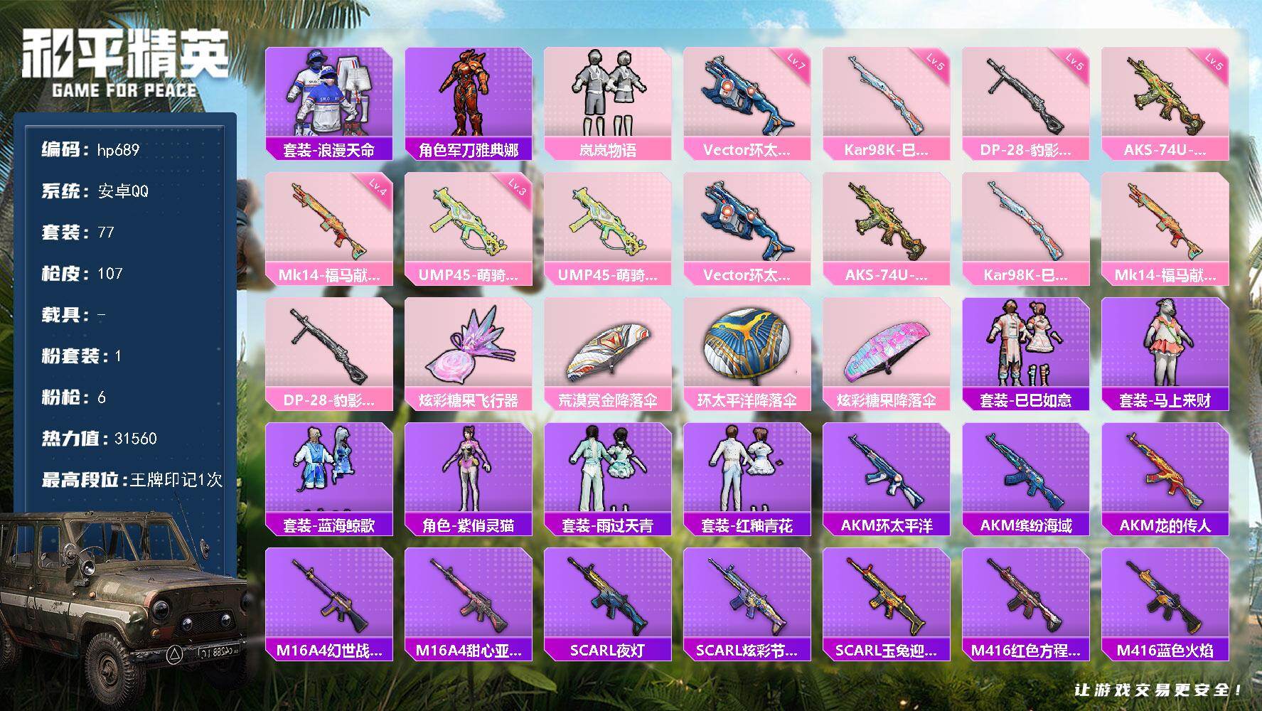 1粉装-6特效枪-0载具-1粉色飞行器-31560热力值-1王牌印记-77套装-107枪皮