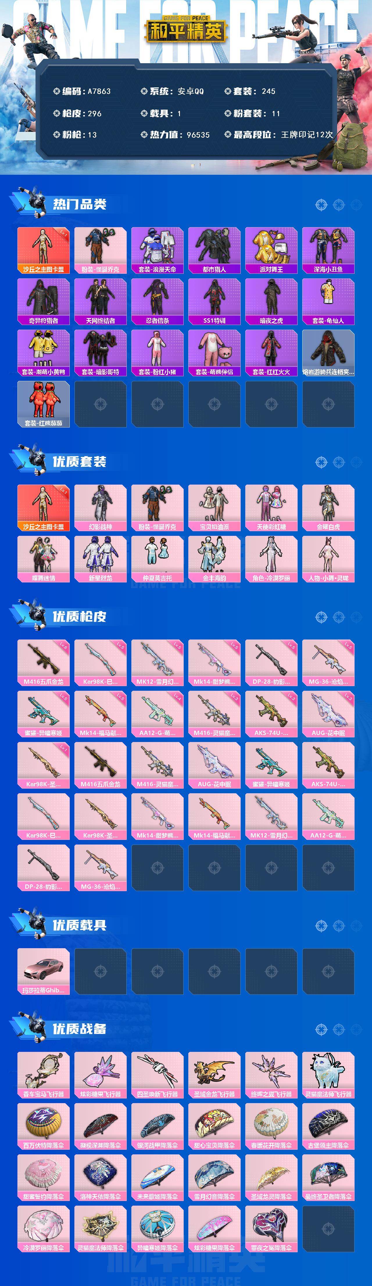 1神装-11粉装-13特效枪-1载具-8粉色飞行器-96535热力值-12王牌印记-245套装-296枪皮