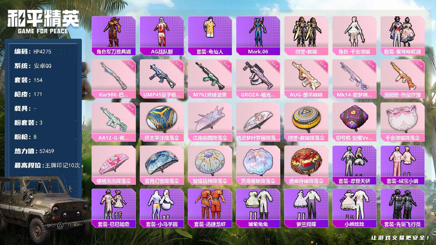 安卓 手Q-3粉装-8特效枪-0载具-0粉色飞行器-52459热力值-10王牌