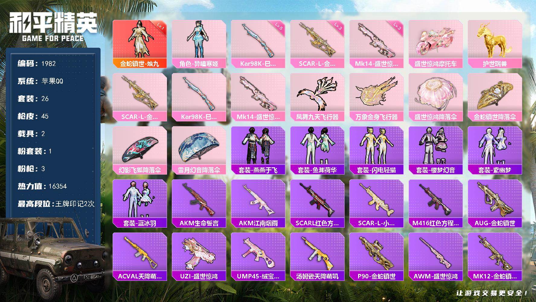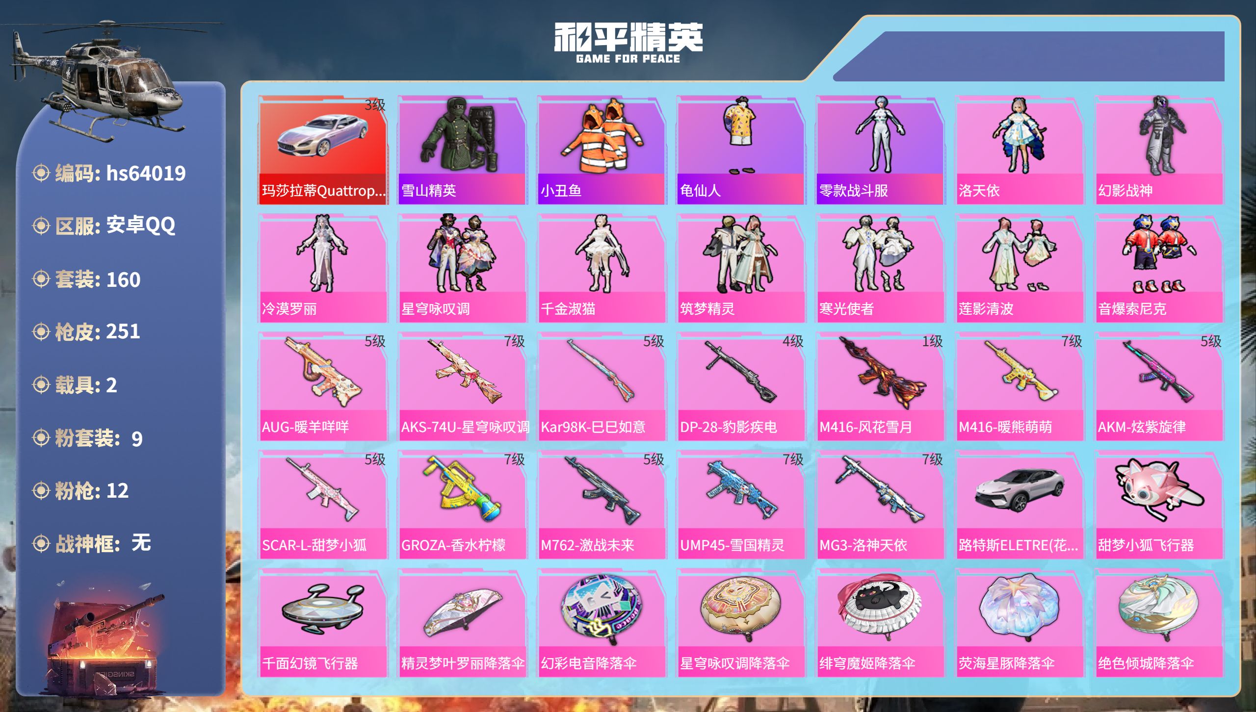 15王牌印记-9粉装-12特效枪-2载具-87950热力值-160套装-251枪皮