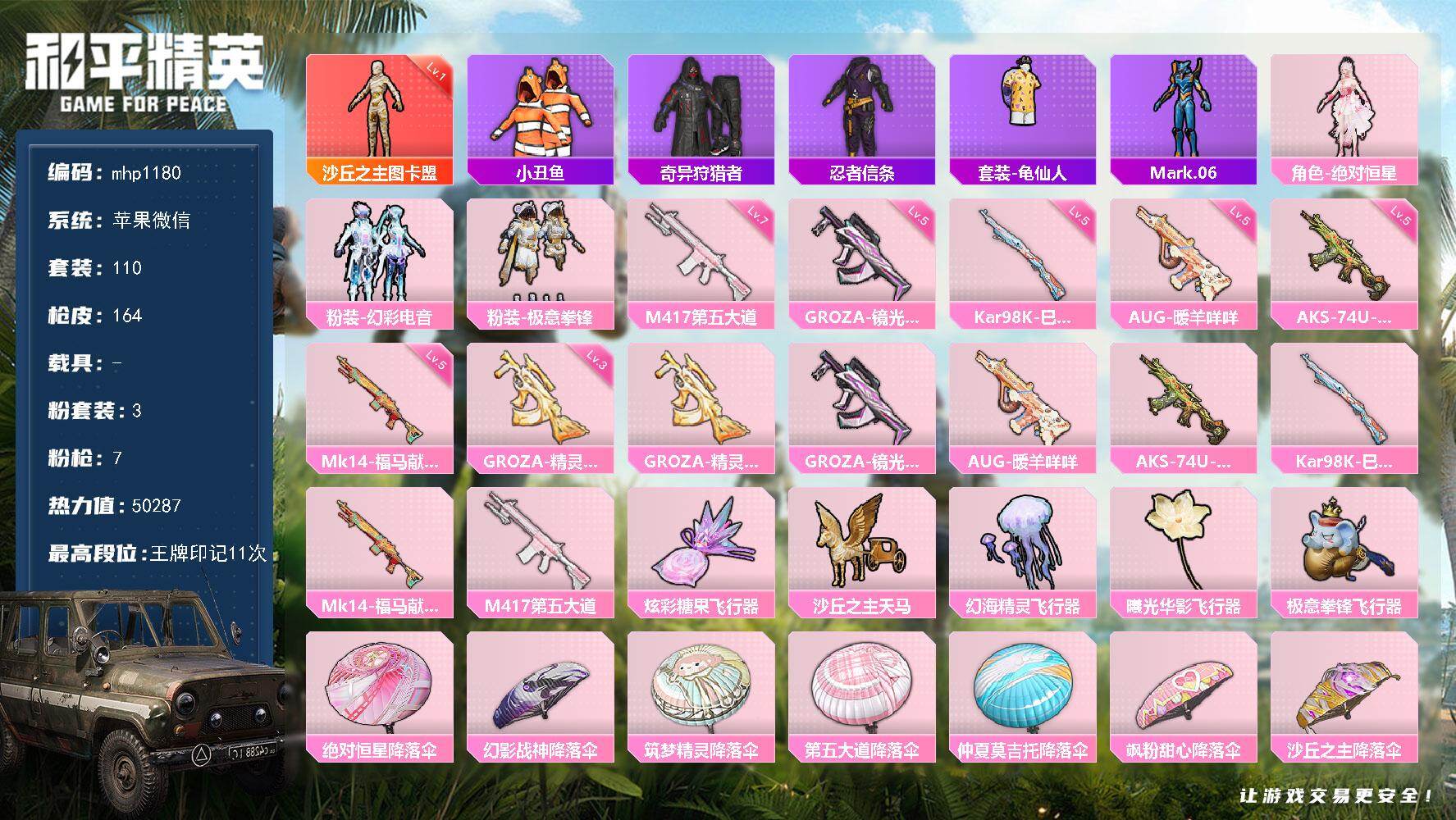 【mhp1180】苹果 微信-1神装-3粉装-7特效枪-0载具-5粉色飞行器-