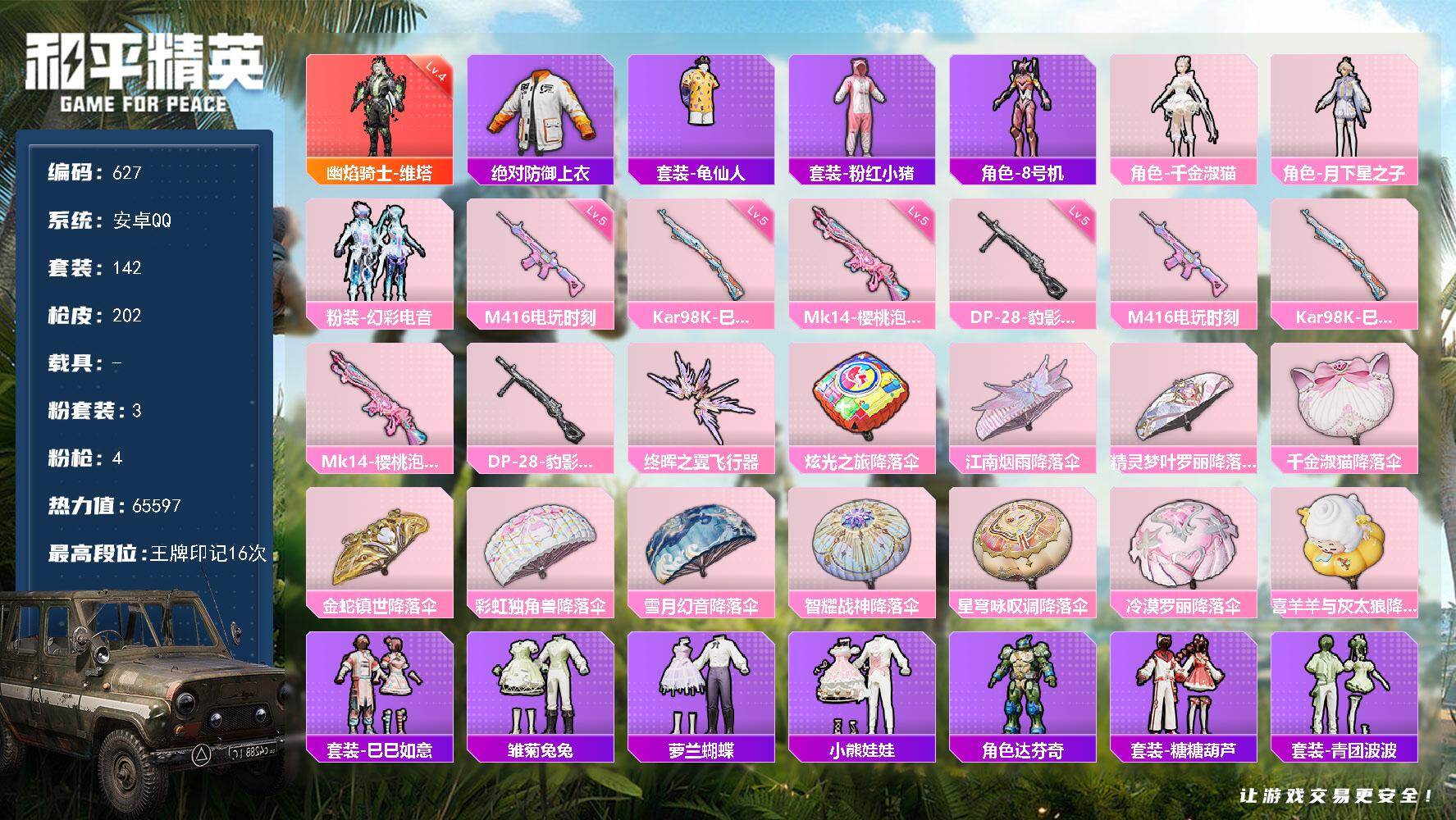 1神装-3粉装-4特效枪-0载具-1粉色飞行器-65597热力值-16王牌印记-142套装-202枪皮