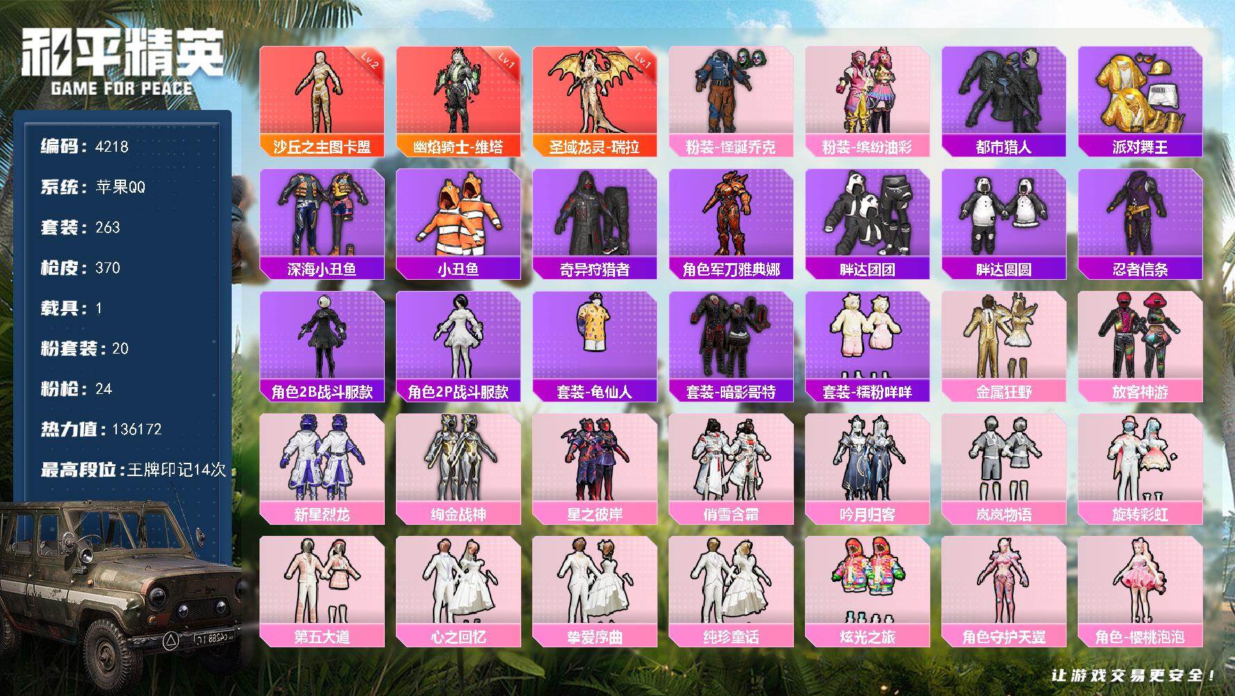 3神装-20粉装-24特效枪-1载具-14粉色飞行器-136172热力值-14王牌印记-263套装-370枪皮