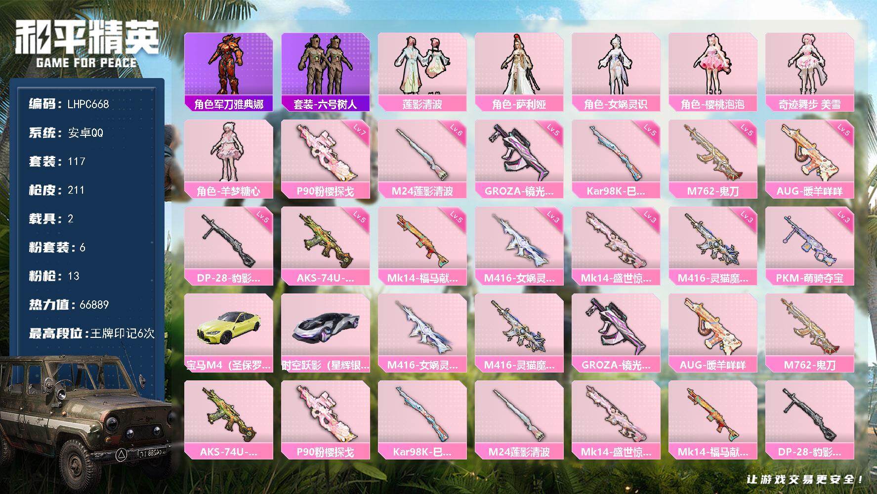 6粉装-13特效枪-2载具-5粉色飞行器-66889热力值-6王牌印记-117套装-211枪皮