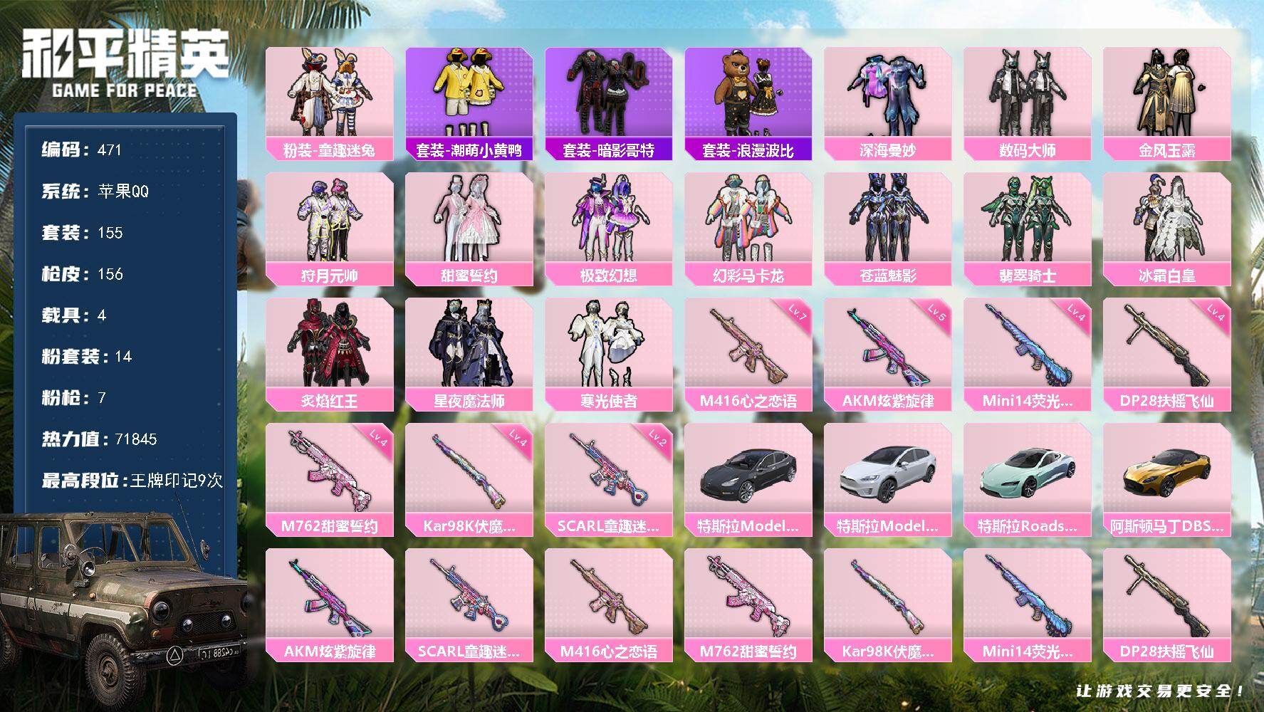 苹果 手Q-14粉装-7特效枪-4载具-5粉色飞行器-71845热力值-9王牌