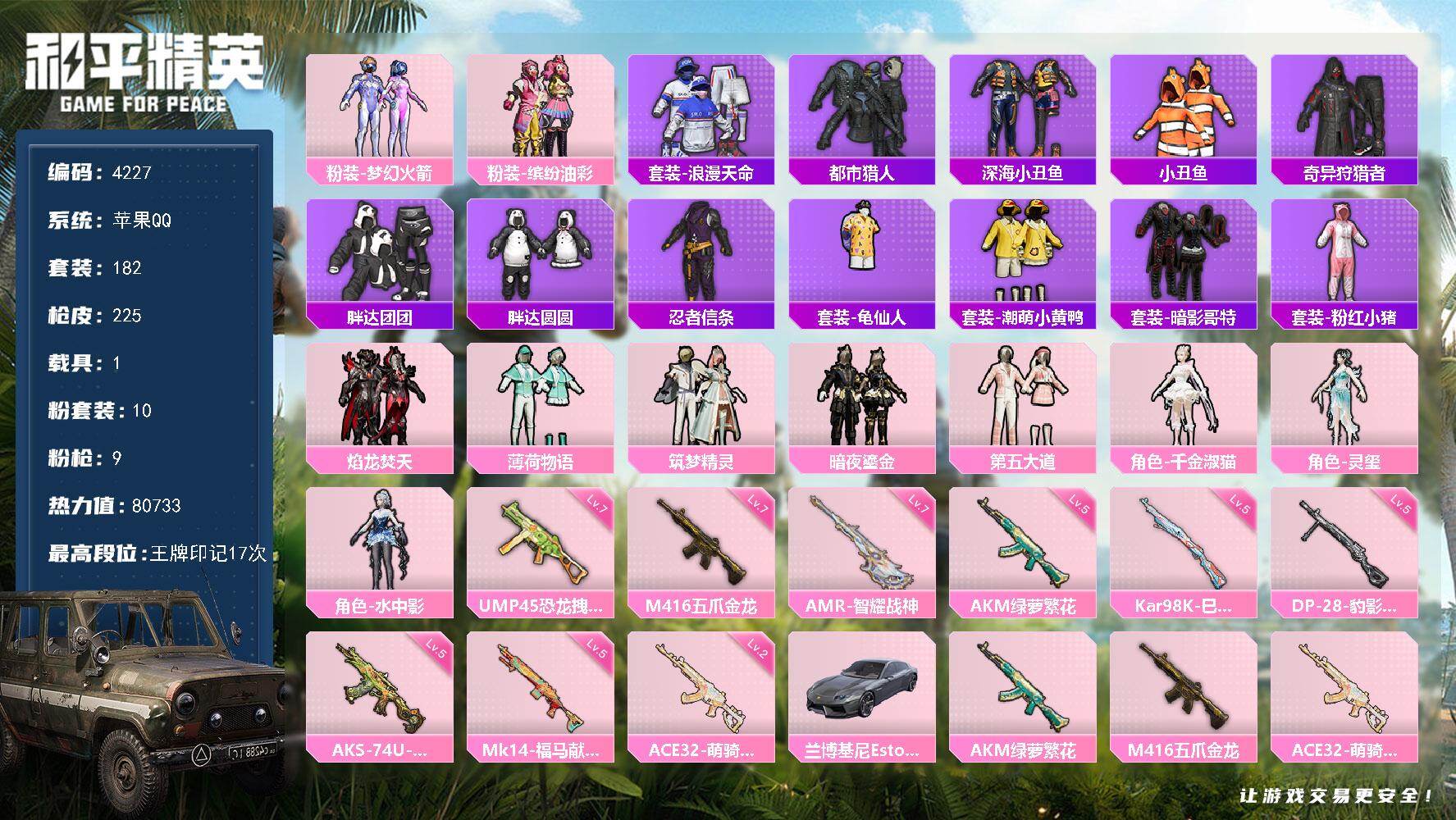 10粉装-9特效枪-1载具-1粉色飞行器-80733热力值-17王牌印记-182套装-225枪皮