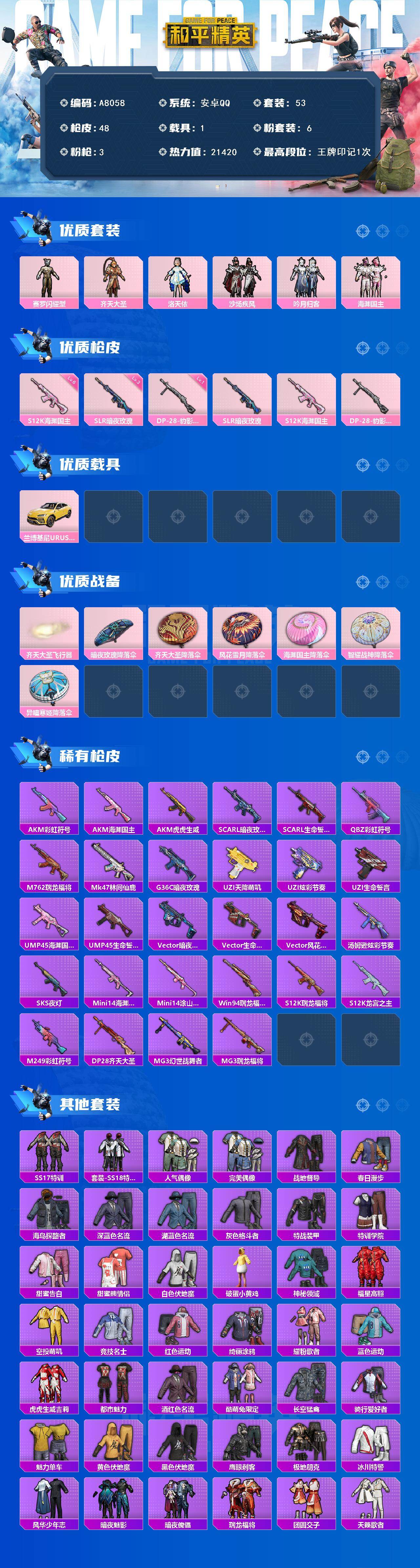 粉装-3特效枪-1载具-1粉色飞行器-21420热力值-1王牌印记-53套装-48枪皮
