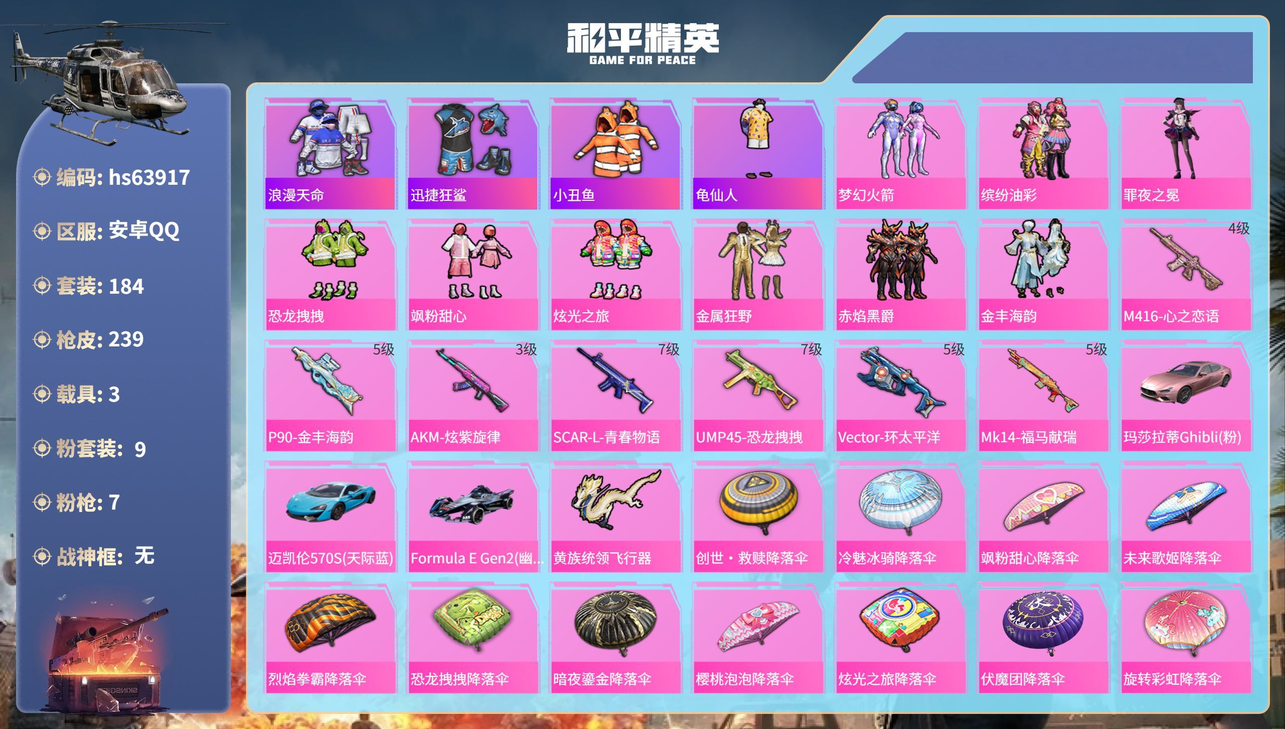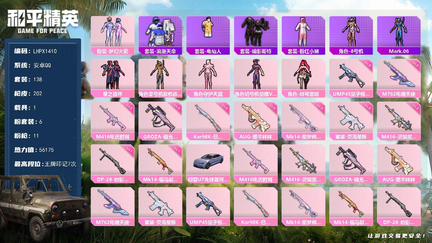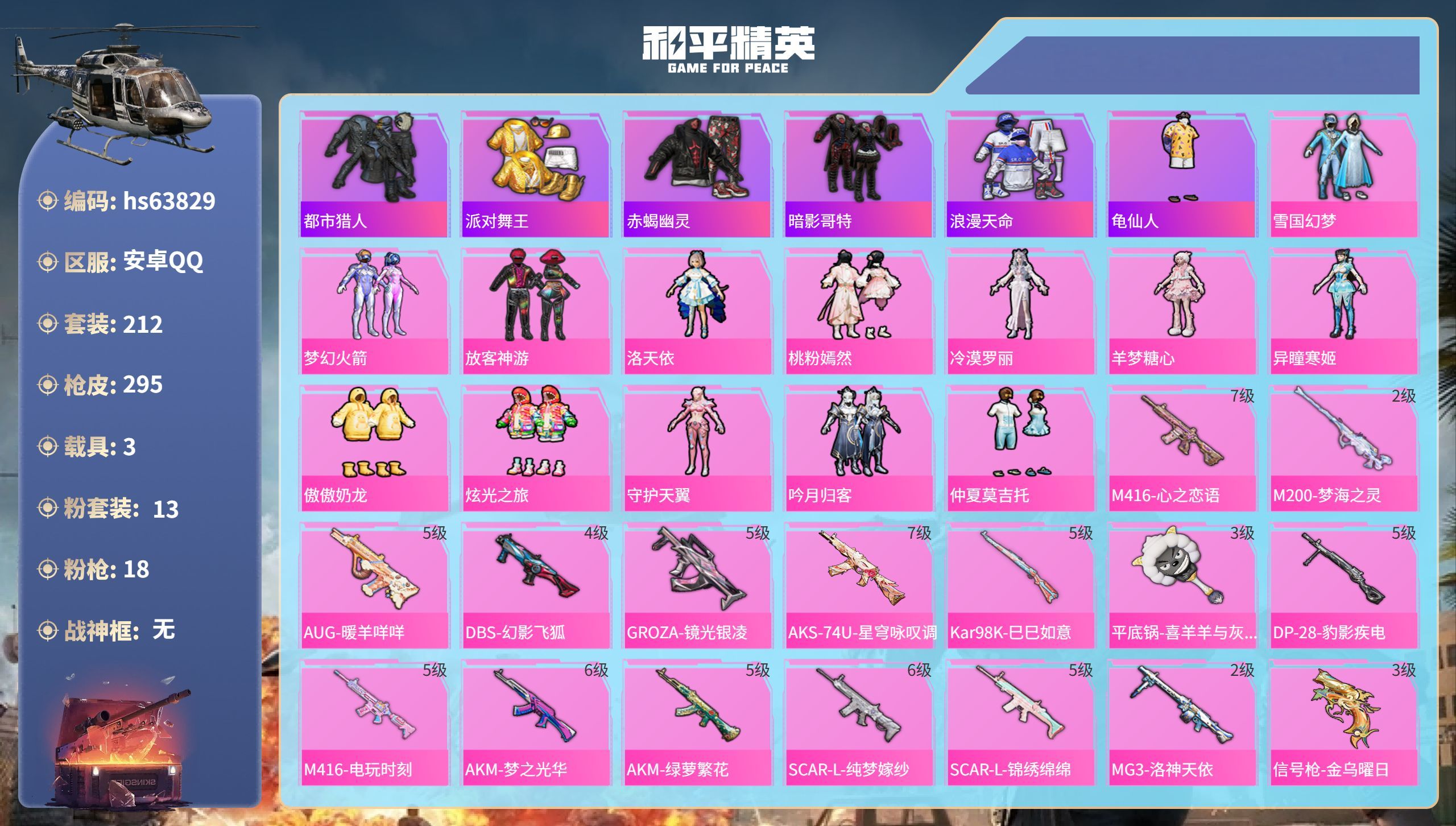 a4302/安卓QQ/0王牌印记-7粉装-4特效枪-4载具-24323热力值-39套装-53枪皮