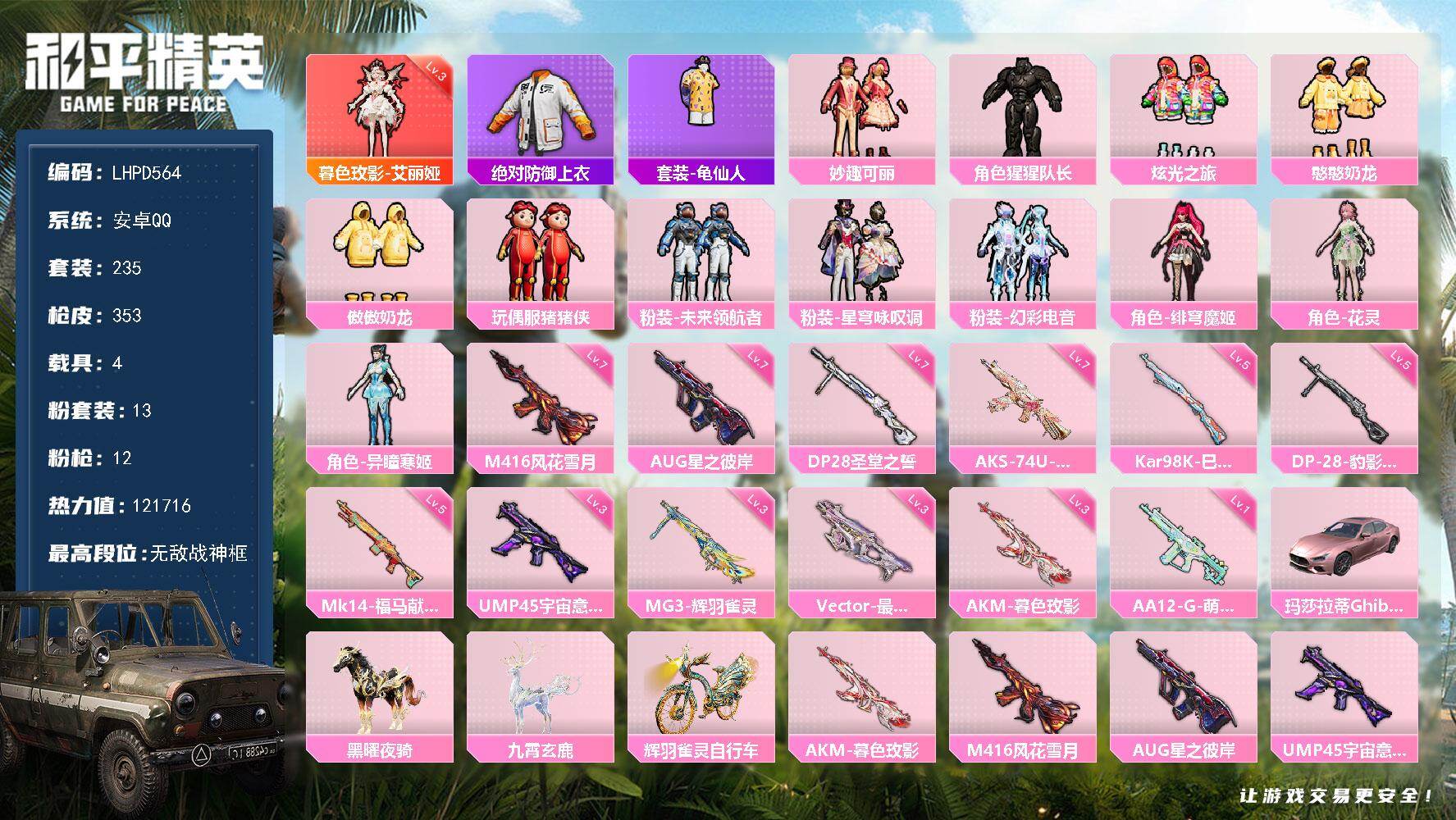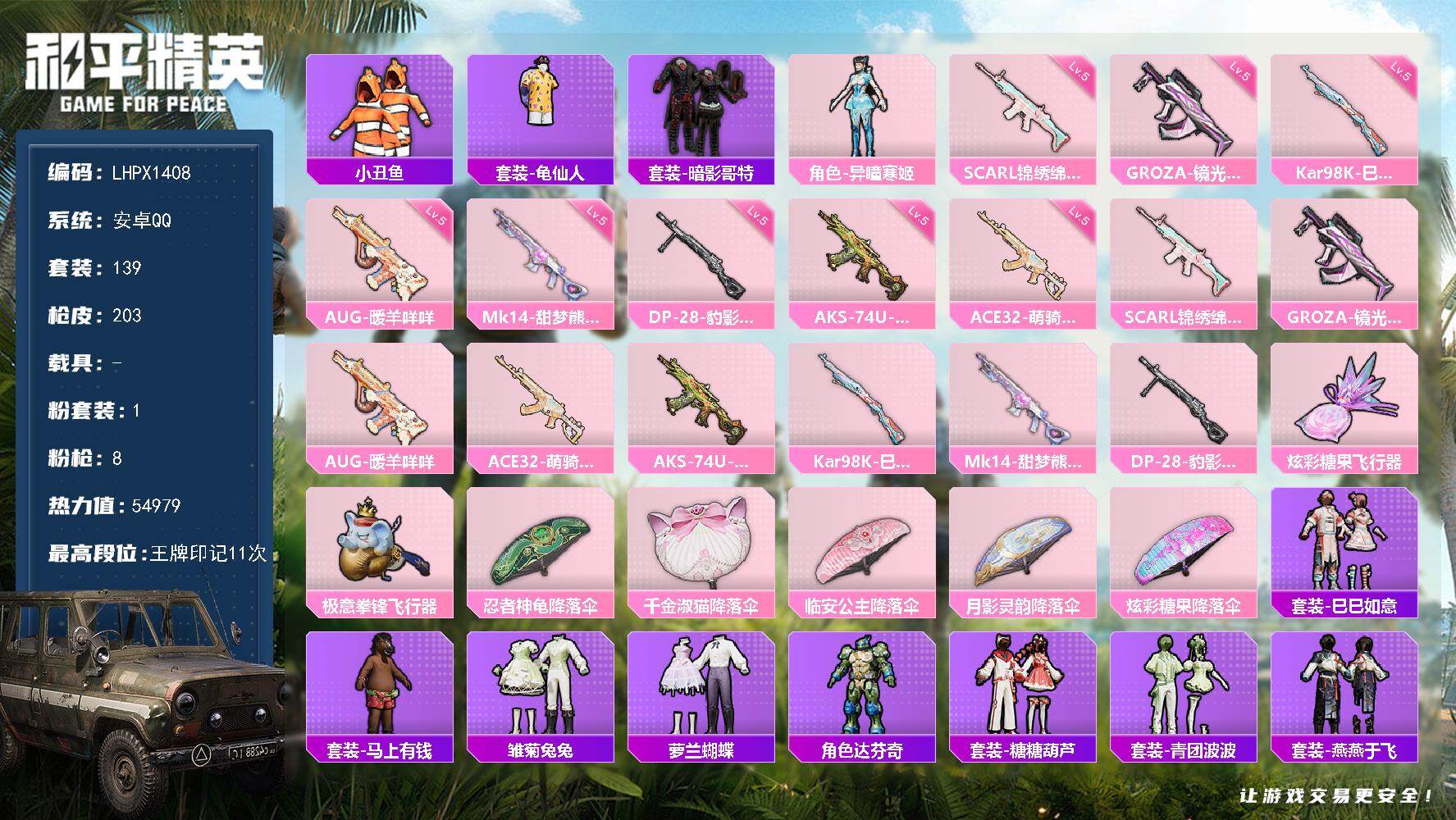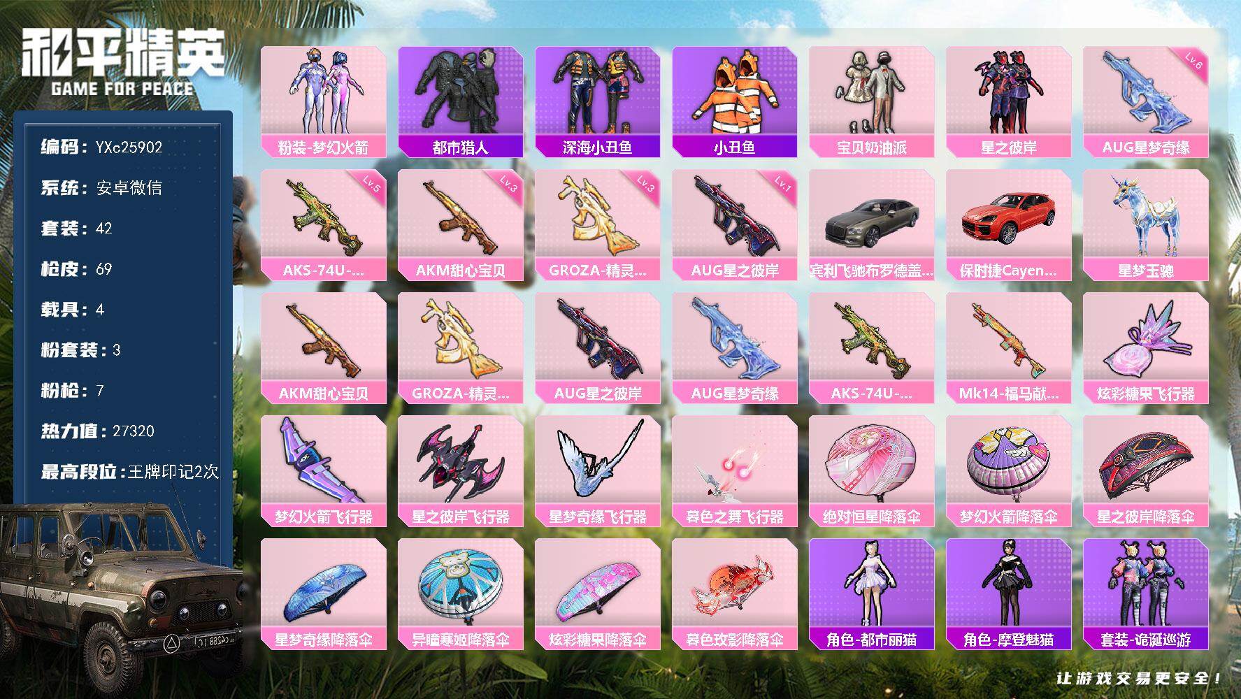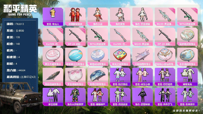 a4302/安卓QQ/0王牌印记-7粉装-4特效枪-4载具-24323热力值-39套装-53枪皮