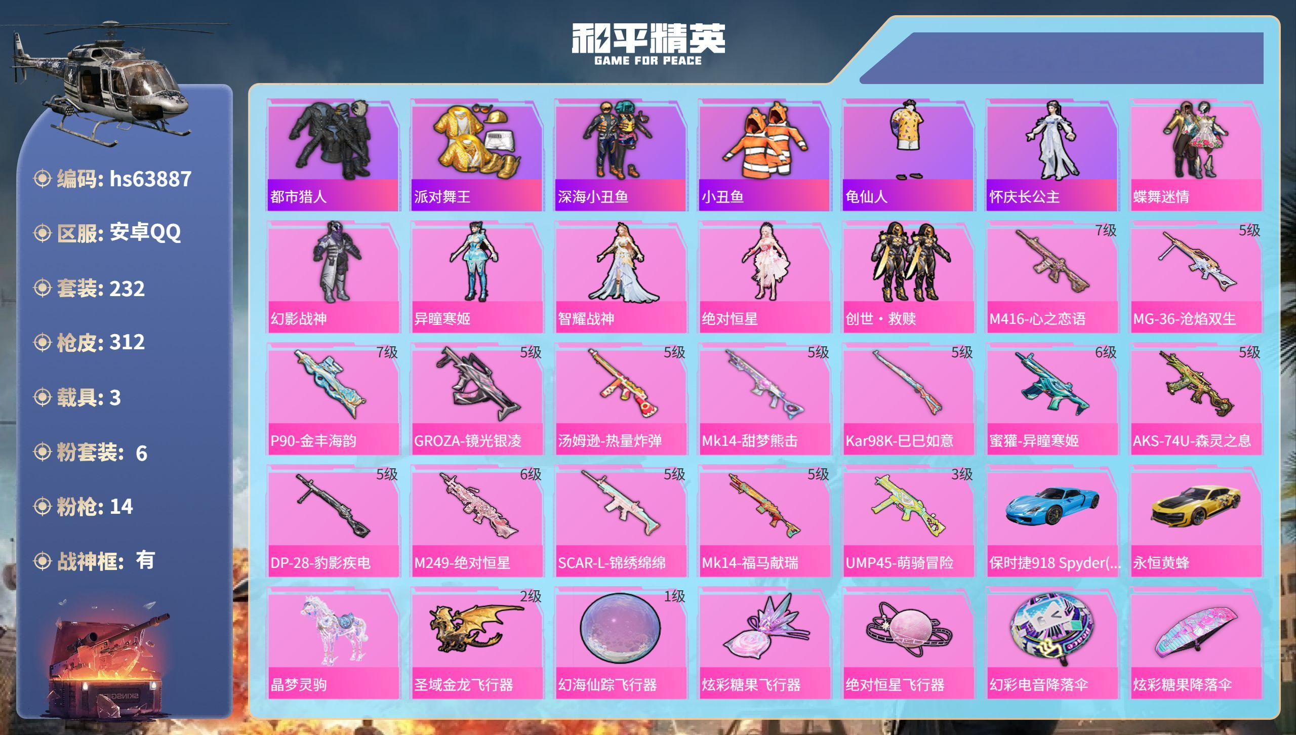 hs63829 安卓手Q-13王牌印记-13粉装-18特效枪-3载具-98478热力值-212套装-