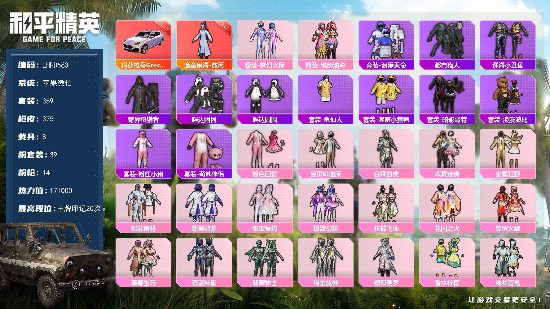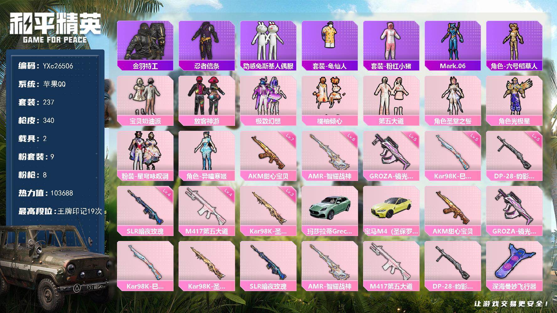 a4292/苹果QQ/5王牌印记-4粉装-5特效枪-2载具-38922热力值-91套装-110枪皮-