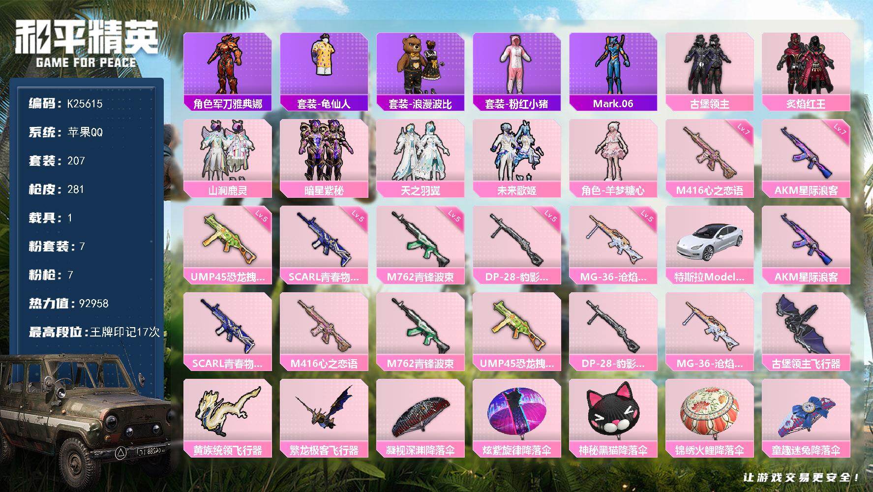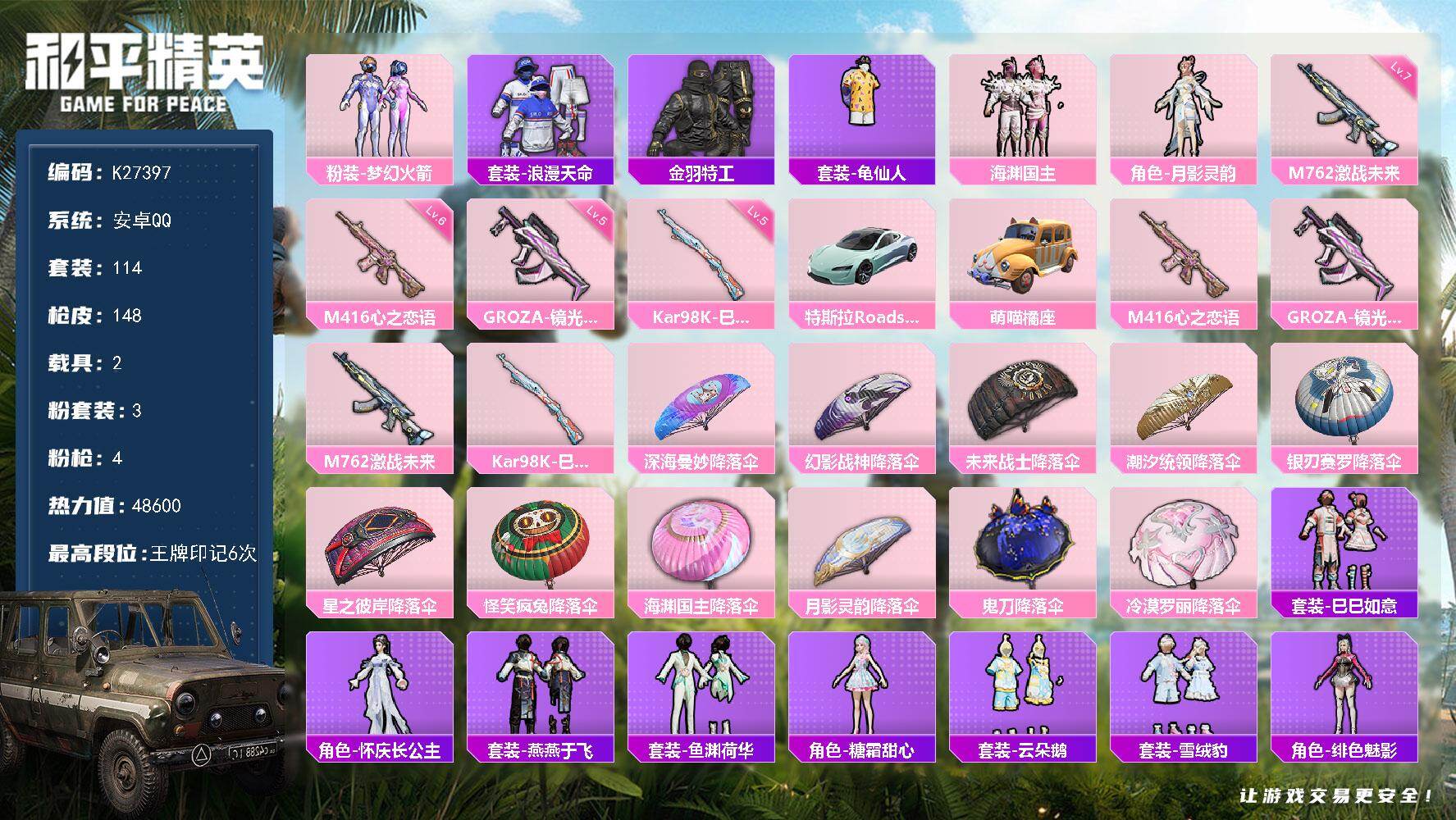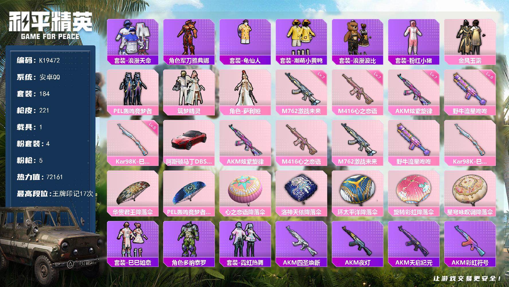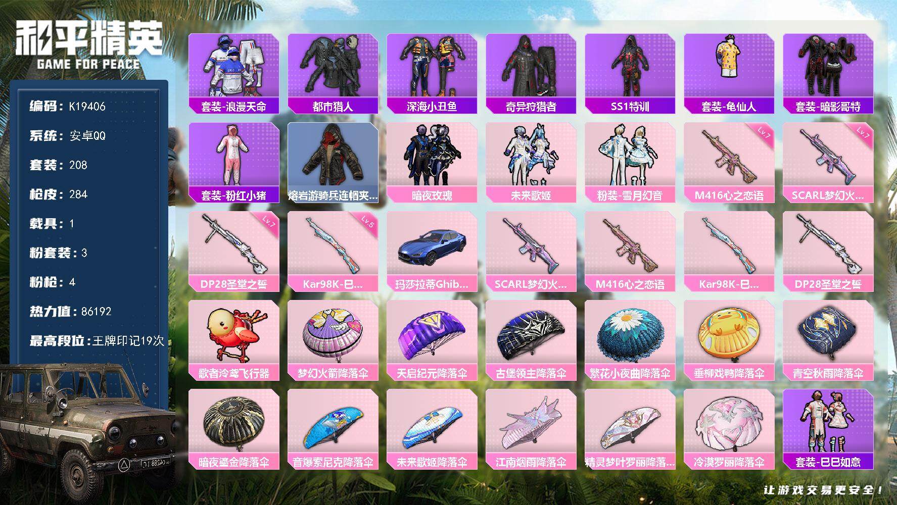 安卓 手Q-3粉装-4特效枪-1载具-1粉色飞行器-86192热力值-19王牌印